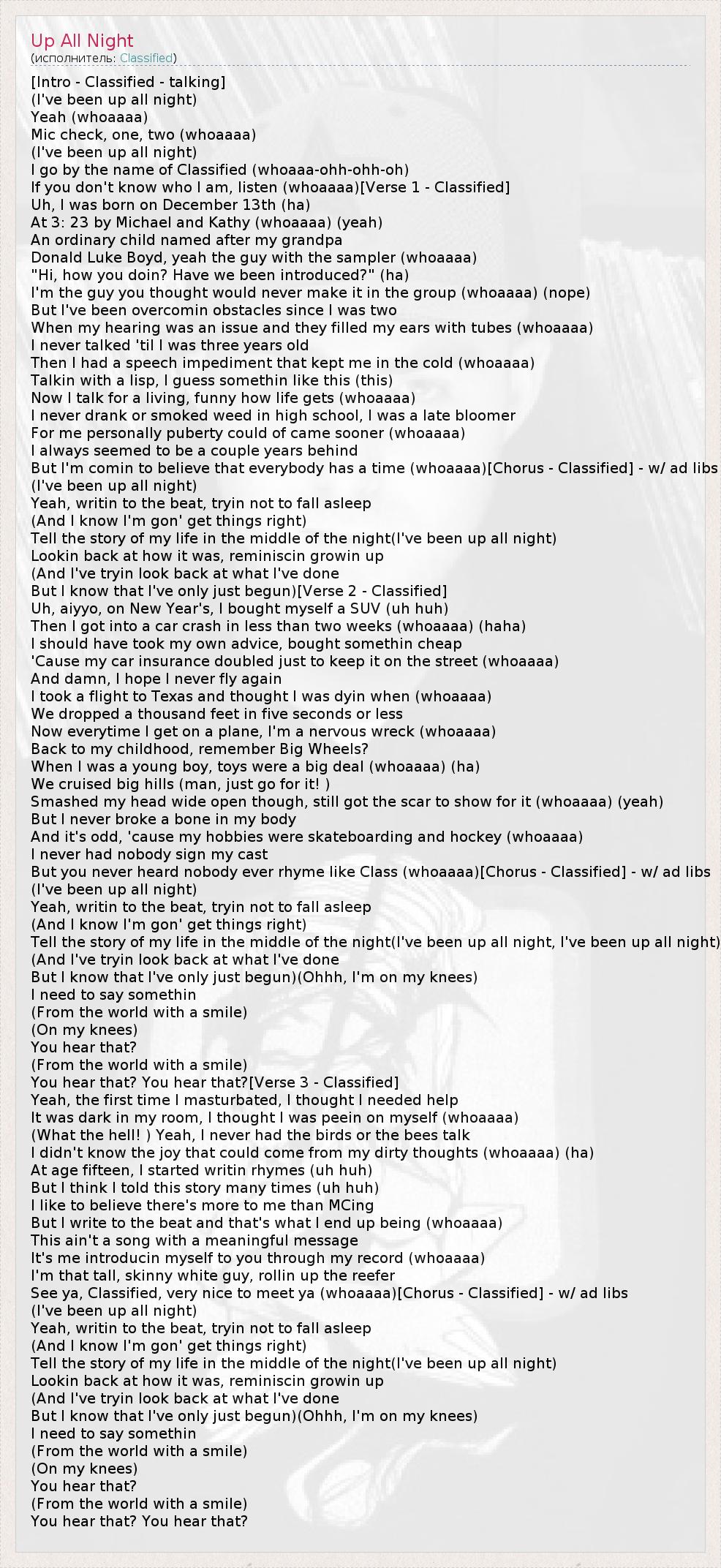 [Intro - Classified - talking] (I've been up all night) Yeah (whoaaaa) Mic check, one, two (whoaaaa) (I've been up all night) I go by the name of Classified (whoaaa-ohh-ohh-oh) If you don't know who I am, listen (whoaaaa)[Verse 1 - Classified] Uh, I was born on December 13th (ha) At 3: 23 by Michael and Kathy (whoaaaa) (yeah) An ordinary child named after my grandpa Donald Luke Boyd, yeah the guy with the sampler (whoaaaa) "Hi, how you doin? Have we been introduced?" (ha) I'm the guy you thought would never make it in the group (whoaaaa) (nope) But I've been overcomin obstacles since I was two When my hearing was an issue and they filled my ears with tubes (whoaaaa) I never talked 'til I was three years old Then I had a speech impediment that kept me in the cold (whoaaaa) Talkin with a lisp, I guess somethin like this (this) Now I talk for a living, funny how life gets (whoaaaa) I never drank or smoked weed in high school, I was a late bloomer For me personally puberty could of came sooner (whoaaaa) I always seemed to be a couple years behind But I'm comin to believe that everybody has a time (whoaaaa)[Chorus - Classified] - w/ ad libs (I've been up all night) Yeah, writin to the beat, tryin not to fall asleep (And I know I'm gon' get things right) Tell the story of my life in the middle of the night(I've been up all night) Lookin back at how it was, reminiscin growin up (And I've tryin look back at what I've done But I know that I've only just begun)[Verse 2 - Classified] Uh, aiyyo, on New Year's, I bought myself a SUV (uh huh) Then I got into a car crash in less than two weeks (whoaaaa) (haha) I should have took my own advice, bought somethin cheap 'Cause my car insurance doubled just to keep it on the street (whoaaaa) And damn, I hope I never fly again I took a flight to Texas and thought I was dyin when (whoaaaa) We dropped a thousand feet in five seconds or less Now everytime I get on a plane, I'm a nervous wreck (whoaaaa) Back to my childhood, remember Big Wheels? When I was a young boy, toys were a big deal (whoaaaa) (ha) We cruised big hills (man, just go for it! ) Smashed my head wide open though, still got the scar to show for it (whoaaaa) (yeah) But I never broke a bone in my body And it's odd, 'cause my hobbies were skateboarding and hockey (whoaaaa) I never had nobody sign my cast But you never heard nobody ever rhyme like Class (whoaaaa)[Chorus - Classified] - w/ ad libs (I've been up all night) Yeah, writin to the beat, tryin not to fall asleep (And I know I'm gon' get things right) Tell the story of my life in the middle of the night(I've been up all night, I've been up all night) (And I've tryin look back at what I've done But I know that I've only just begun)(Ohhh, I'm on my knees) I need to say somethin (From the world with a smile) (On my knees) You hear that? (From the world with a smile) You hear that? You hear that?[Verse 3 - Classified] Yeah, the first time I masturbated, I thought I needed help It was dark in my room, I thought I was peein on myself (whoaaaa) (What the hell! ) Yeah, I never had the birds or the bees talk I didn't know the joy that could come from my dirty thoughts (whoaaaa) (ha) At age fifteen, I started writin rhymes (uh huh) But I think I told this story many times (uh huh) I like to believe there's more to me than MCing But I write to the beat and that's what I end up being (whoaaaa) This ain't a song with a meaningful message It's me introducin myself to you through my record (whoaaaa) I'm that tall, skinny white guy, rollin up the reefer See ya, Classified, very nice to meet ya (whoaaaa)[Chorus - Classified] - w/ ad libs (I've been up all night) Yeah, writin to the beat, tryin not to fall asleep (And I know I'm gon' get things right) Tell the story of my life in the middle of the night(I've been up all night) Lookin back at how it was, reminiscin growin up (And I've tryin look back at what I've done But I know that I've only just begun)(Ohhh, I'm on my knees) I need to say somethin (From the world with a smile) (On my knees) You hear that? (From the world with a smile) You hear that? You hear that?