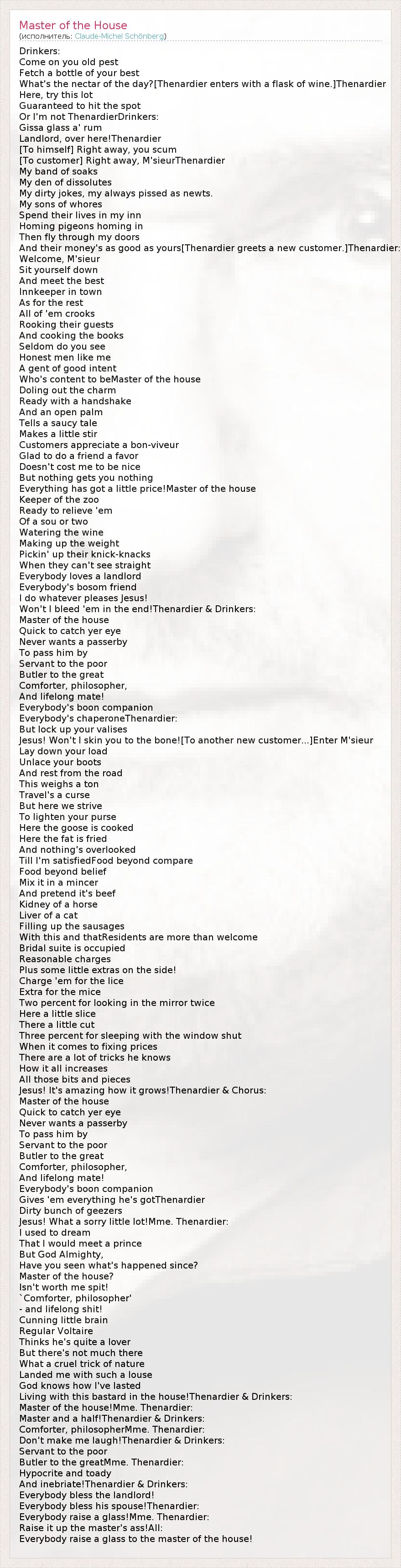 Won't I bleed 'em in the end!Thenardier & Drinkers: