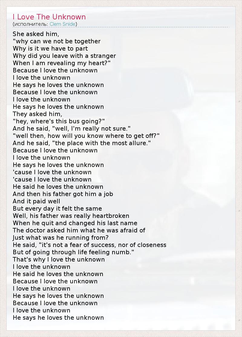 She asked him, "why can we not be together Why is it we have to part Why did you leave with a stranger When I am revealing my heart?" Because I love the unknown I love the unknown He says he loves the unknown Because I love the unknown I love the unknown He says he loves the unknown They asked him, "hey, where's this bus going?" And he said, "well, I'm really not sure." "well then, how will you know where to get off?" And he said, "the place with the most allure." Because I love the unknown I love the unknown He says he loves the unknown 'cause I love the unknown 'cause I love the unknown He said he loves the unknown And then his father got him a job And it paid well But every day it felt the same Well, his father was really heartbroken When he quit and changed his last name The doctor asked him what he was afraid of Just what was he running from? He said, "it's not a fear of success, nor of closeness But of going through life feeling numb." That's why I love the unknown I love the unknown He said he loves the unknown Because I love the unknown I love the unknown He says he loves the unknown Because I love the unknown I love the unknown He says he loves the unknown