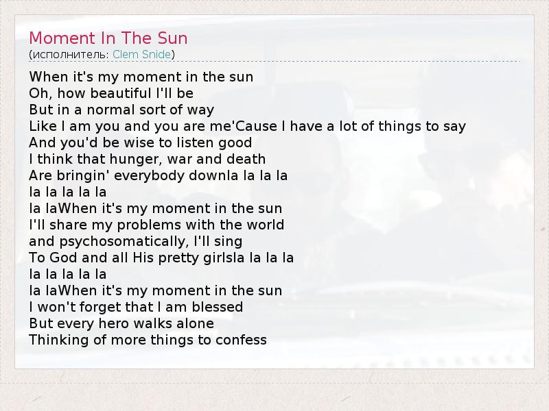 When it's my moment in the sun Oh, how beautiful I'll be But in a normal sort of way Like I am you and you are me'Cause I have a lot of things to say And you'd be wise to listen good I think that hunger, war and death Are bringin' everybody downla la la la la la la la la la laWhen it's my moment in the sun I'll share my problems with the world and psychosomatically, I'll sing To God and all His pretty girlsla la la la la la la la la la laWhen it's my moment in the sun I won't forget that I am blessed But every hero walks alone Thinking of more things to confess