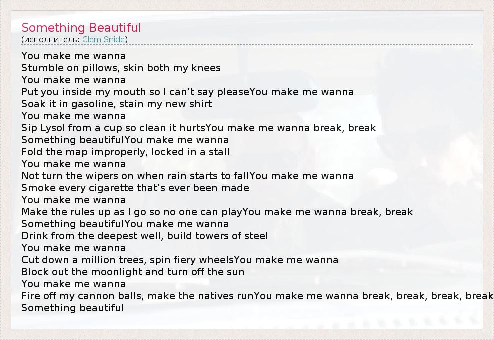 You make me wanna Stumble on pillows, skin both my knees You make me wanna Put you inside my mouth so I can't say pleaseYou make me wanna Soak it in gasoline, stain my new shirt You make me wanna Sip Lysol from a cup so clean it hurtsYou make me wanna break, break Something beautifulYou make me wanna Fold the map improperly, locked in a stall You make me wanna Not turn the wipers on when rain starts to fallYou make me wanna Smoke every cigarette that's ever been made You make me wanna Make the rules up as I go so no one can playYou make me wanna break, break Something beautifulYou make me wanna Drink from the deepest well, build towers of steel You make me wanna Cut down a million trees, spin fiery wheelsYou make me wanna Block out the moonlight and turn off the sun You make me wanna Fire off my cannon balls, make the natives runYou make me wanna break, break, break, break Something beautiful