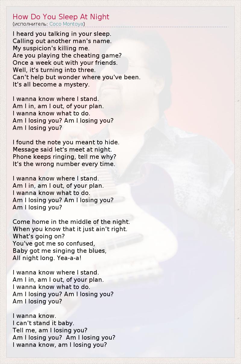 Я слышал, как ты разговариваешь во сне. Произносишь имя другого мужчины. Подозрение убивает меня... Неужели ты идешь на обман? Один раз в неделю ты со своими друзьями. Хорошо, но одна встреча доходит и до трех. Не могу не задаться вопросом, где ты была. Все это становится тайной. Я хочу знать, где я? Участвую я, или нет, в твоем плане. Я бы хотел знать, что мне делать? Я теряю тебя? Я теряю тебя? Неужели, я теряю тебя? Я нашел записи, которые ты считала спрятанными. Сообщение гласило: давай встретимся ночью. В телефоне только гудки, скажи мне, почему? Постоянно... это неверный номер. Я хочу знать, где я? Участвую я, или нет, в твоем плане. Я бы хотел знать, что мне делать? Я теряю тебя? Я теряю тебя? Неужели, я теряю тебя? Приходишь домой к середине ночи. Хотя знаешь, что это не правильно. Что происходит? Ты сбила меня с толку, милая, Добилась того, что теперь я только пою блюз Всю ночь напролет. Я хочу знать, где я? Участвую я, или нет, в твоем плане. Я бы хотел знать, что мне делать? Я теряю тебя? Я теряю тебя? Неужели, я теряю тебя? Я хочу знать. Я не могу так этого оставить, детка. Скажи мне, я теряю тебя? Я теряю тебя? Я теряю тебя? Я хочу знать, я теряю тебя?