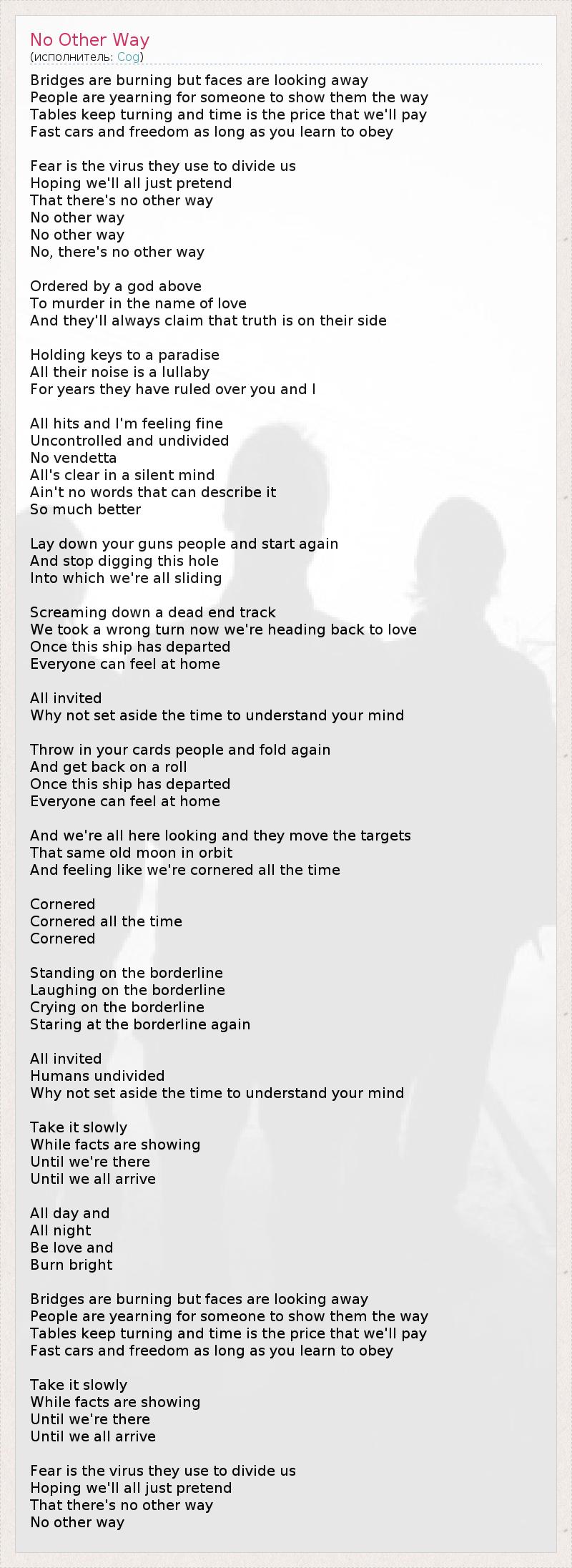 А как ты думаешь, о чем песня "No Other Way" ?