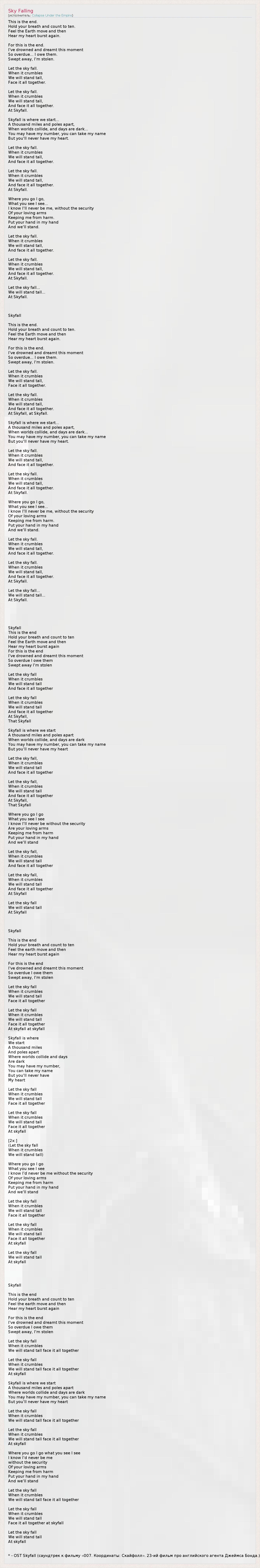 Это конец. Задержи дыхание и досчитай до десяти. Почувствуй вращение Земли, а затем Услышь, как мое сердце взрывается вновь. Это конец. Я тонула и мечтала об этом мгновении, Но он настал слишком поздно... Я в долгу перед ними. Я в смятении, я власти этого чувства. Пусть небеса обрушатся. Когда они разверзнутся, Мы не дрогнем, Мы выдержим это вместе. Пусть небеса обрушатся. Когда они разверзнутся, Мы не дрогнем, Мы выдержим это вместе. На координатах "Скайфолл". Координаты "Скайфолл", вот где все началось... Разделенные тысячами километров, на разных полюсах, Когда миры враждуют друг с другом, а дни все мрачнее... Ты можешь получить мой номер, можешь назваться моим именем, Но тебе на завладеть моим сердцем. Пусть небеса обрушатся. Когда они разверзнутся, Мы не дрогнем, Мы выдержим это вместе. Пусть небеса обрушатся. Когда они разверзнутся, Мы не дрогнем, Мы выдержим это вместе. На координатах "Скайфолл". Я иду туда, куда идешь ты, Я вижу то, что видишь ты... Я знаю, что не буду собой без защиты Твоих нежных объятий, Оберегающих меня от зла. Вложи свою руку в мою - И мы выстоим. Пусть небеса обрушатся. Когда они разверзнутся, Мы не дрогнем, Мы выдержим это вместе. Пусть небеса обрушатся. Когда они разверзнутся, Мы не дрогнем, Мы выдержим это вместе. На координатах "Скайфолл". Пусть небеса обрушатся... Мы не дрогнем... На координатах "Скайфолл". Координаты "Скайфолл"** (перевод Юрий Бардин) Это конец. Ты замри, и счёт веди, В Пульсе Земли, затем - Сердца взрыв слышен вновь... Но, всему – конец... На дне, в мечтах, в захвате... Всё поздно, я должна им... В ауте, в расплате... Небу падать, Отверзаясь, Устоим мы! - Встретим то все вместе... Небу падать, Отверзаясь, Устоим мы! - Встретим то все вместе... В Небесах... (На "Скайфолл") В Небесах... (На "Скайфолл") Начало - в Небесах, Миллиарды миль на Полюс вей, В войне миров, где сумрак дней... Можешь взять мой номер, да и имя тож, Только сердце не возьмёшь!!! Небу падать, Отверзаясь, Устоим мы! - Встретим то все вместе... Небу падать, Отверзаясь, Устоим мы! - Встретим то все вместе... В Небесах... (На "Скайфолл") Я туда, с тобой! Что там есть... - для нас... Я знаю – не быть мне собой, без этой защиты Твоих тёплых рук, Сохрани меня, Мою руку возьми... - Устоим! Небу падать, Отверзаясь, Устоим мы! - Встретим то все вместе... Небу падать, Отверзаясь, Устоим мы! - Встретим то все вместе... В Небесах! (На "Скайфолл"!) Небу падать, Устоим мы! - В Небесах! (На "Скайфолл"!) ** поэтический (эквиритмический) перевод с элементами творческой интерпретации Небо падёт (перевод Павел из Санкт-Петербурга) Это - конец. Задержи воздух на десять чтец, Ощути, как стоишь на Земле, И - моего сердца взрывной конец! Это конец, the end, Я утонула в сей момент, Я опоздала, - с меня процент... Я захвачена, и сбита... Пусть небо падёт! Когда это произойдёт, Мы не дрогнем, мы Вместе переживём это... Небо рухнет! Мы не струхнем! Мы с тобой, держась за руки, Переживём это В "Скайфолле", В "Скайфолле". "Скайфоллом" путь начать, Нам, кого мили продолжают разделять! Когда дни нам всю жизнь мрачат, Ты можешь мой номер взять, и моё имя взять, Но тебе сердца не отнять! Пусть небо падёт! Когда это произойдёт, Мы не дрогнем, мы Вместе переживём это... Небо рухнет! Мы не струхнем! Мы с тобой, Держась за руки Переживём это В "Скайфолле". Иду туда, куда и ты, Вижу то, что видишь ты, Я знаю, никогда я не останусь без защиты! Твои руки ли Берегут меня? Мою руку во