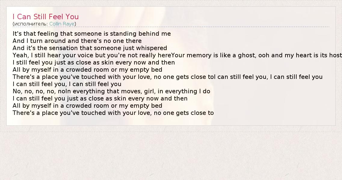 It's that feeling that someone is standing behind me And I turn around and there's no one there And it's the sensation that someone just whispered Yeah, I still hear your voice but you're not really hereYour memory is like a ghost, ooh and my heart is its host I still feel you just as close as skin every now and then All by myself in a crowded room or my empty bed There's a place you've touched with your love, no one gets close toI can still feel you, I can still feel you I can still feel you, I can still feel you No, no, no, no, noIn everything that moves, girl, in everything I do I can still feel you just as close as skin every now and then All by myself in a crowded room or my empty bed There's a place you've touched with your love, no one gets close to
