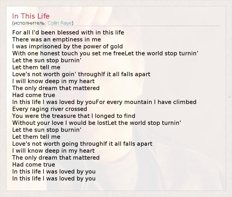 For all I'd been blessed with in this life There was an emptiness in me I was imprisoned by the power of gold With one honest touch you set me freeLet the world stop turnin' Let the sun stop burnin' Let them tell me Love's not worth goin' throughIf it all falls apart I will know deep in my heart The only dream that mattered Had come true In this life I was loved by youFor every mountain I have climbed Every raging river crossed You were the treasure that I longed to find Without your love I would be lostLet the world stop turnin' Let the sun stop burnin' Let them tell me Love's not worth going throughIf it all falls apart I will know deep in my heart The only dream that mattered Had come true In this life I was loved by you In this life I was loved by you