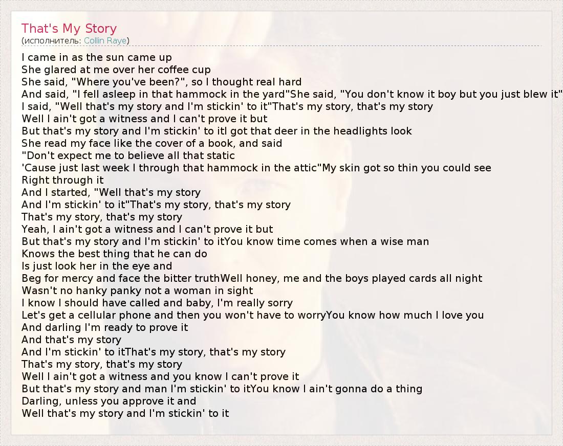 I came in as the sun came up She glared at me over her coffee cup She said, "Where you've been?", so I thought real hard And said, "I fell asleep in that hammock in the yard"She said, "You don't know it boy but you just blew it" I said, "Well that's my story and I'm stickin' to it"That's my story, that's my story Well I ain't got a witness and I can't prove it but But that's my story and I'm stickin' to itI got that deer in the headlights look She read my face like the cover of a book, and said "Don't expect me to believe all that static 'Cause just last week I through that hammock in the attic"My skin got so thin you could see Right through it And I started, "Well that's my story And I'm stickin' to it"That's my story, that's my story That's my story, that's my story Yeah, I ain't got a witness and I can't prove it but But that's my story and I'm stickin' to itYou know time comes when a wise man Knows the best thing that he can do Is just look her in the eye and Beg for mercy and face the bitter truthWell honey, me and the boys played cards all night Wasn't no hanky panky not a woman in sight I know I should have called and baby, I'm really sorry Let's get a cellular phone and then you won't have to worryYou know how much I love you And darling I'm ready to prove it And that's my story And I'm stickin' to itThat's my story, that's my story That's my story, that's my story Well I ain't got a witness and you know I can't prove it But that's my story and man I'm stickin' to itYou know I ain't gonna do a thing Darling, unless you approve it and Well that's my story and I'm stickin' to it