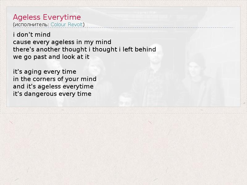 i don't mind cause every ageless in my mind there's another thought i thought i left behind we go past and look at it it's aging every time in the corners of your mind and it's ageless everytime it's dangerous every time