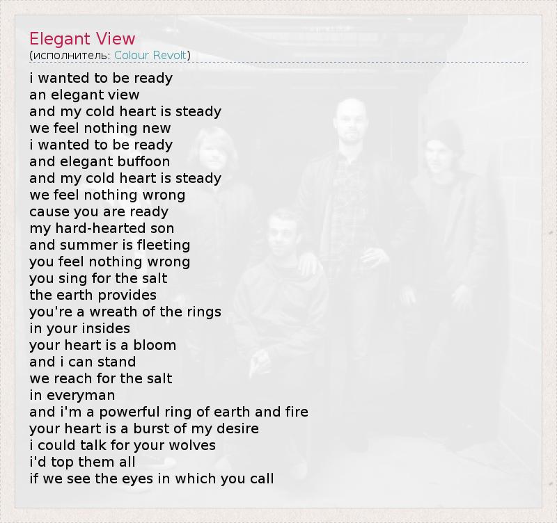 i wanted to be ready an elegant view and my cold heart is steady we feel nothing new i wanted to be ready and elegant buffoon and my cold heart is steady we feel nothing wrong cause you are ready my hard-hearted son and summer is fleeting you feel nothing wrong you sing for the salt the earth provides you're a wreath of the rings in your insides your heart is a bloom and i can stand we reach for the salt in everyman and i'm a powerful ring of earth and fire your heart is a burst of my desire i could talk for your wolves i'd top them all if we see the eyes in which you call