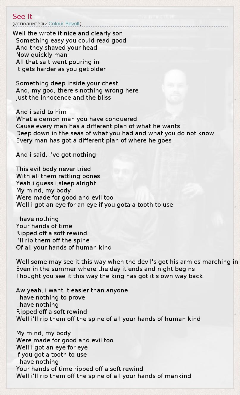Well the wrote it nice and clearly son Something easy you could read good And they shaved your head Now quickly man All that salt went pouring in It gets harder as you get older Something deep inside your chest And, my god, there's nothing wrong here Just the innocence and the bliss And i said to him What a demon man you have conquered Cause every man has a different plan of what he wants Deep down in the seas of what you had and what you do not know Every man has got a different plan of where he goes And i said, i've got nothing This evil body never tried With all them rattling bones Yeah i guess i sleep alright My mind, my body Were made for good and evil too Well i got an eye for an eye if you gota a tooth to use I have nothing Your hands of time Ripped off a soft rewind I'll rip them off the spine Of all your hands of human kind Well some may see it this way when the devil's got his armies marching in Even in the summer where the day it ends and night begins Thought you see it this way the king has got it's own way back Aw yeah, i want it easier than anyone I have nothing to prove I have nothing Ripped off a soft rewind Well i'll rip them off the spine of all your hands of human kind My mind, my body Were made for good and evil too Well i got an eye for eye If you got a tooth to use I have nothing Your hands of time ripped off a soft rewind Well i'll rip them off the spine of all your hands of mankind