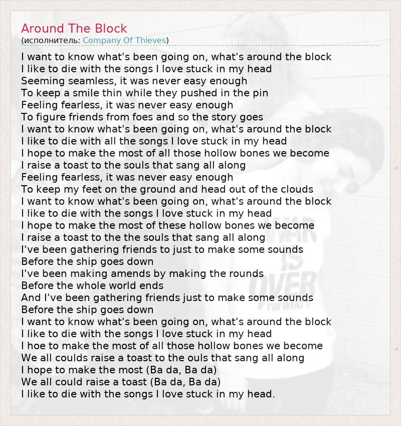 I want to know what's been going on, what's around the block I like to die with the songs I love stuck in my head Seeming seamless, it was never easy enough To keep a smile thin while they pushed in the pin Feeling fearless, it was never easy enough To figure friends from foes and so the story goes I want to know what's been going on, what's around the block I like to die with all the songs I love stuck in my head I hope to make the most of all those hollow bones we become I raise a toast to the souls that sang all along Feeling fearless, it was never easy enough To keep my feet on the ground and head out of the clouds I want to know what's been going on, what's around the block I like to die with the songs I love stuck in my head I hope to make the most of these hollow bones we become I raise a toast to the the souls that sang all along I've been gathering friends to just to make some sounds Before the ship goes down I've been making amends by making the rounds Before the whole world ends And I've been gathering friends just to make some sounds Before the ship goes down I want to know what's been going on, what's around the block I like to die with the songs I love stuck in my head I hoe to make the most of all those hollow bones we become We all coulds raise a toast to the ouls that sang all along I hope to make the most (Ba da, Ba da) We all could raise a toast (Ba da, Ba da) I like to die with the songs I love stuck in my head.