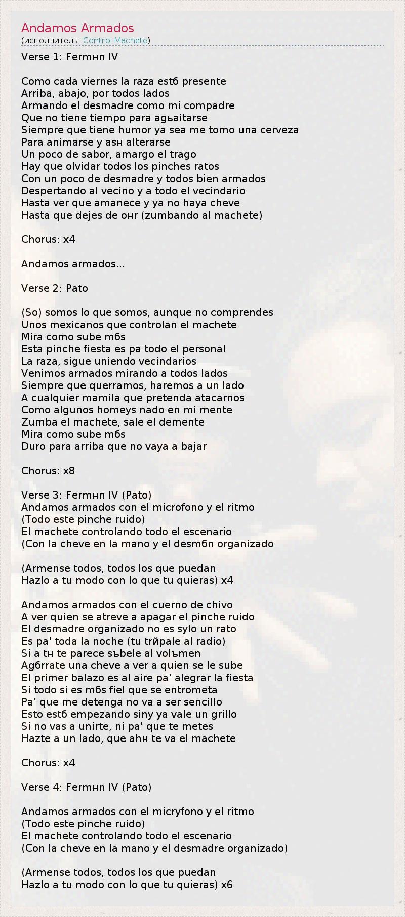 Verse 1: Fermнn IV Como cada viernes la raza estб presente Arriba, abajo, por todos lados Armando el desmadre como mi compadre Que no tiene tiempo para agьaitarse Siempre que tiene humor ya sea me tomo una cerveza Para animarse y asн alterarse Un poco de sabor, amargo el trago Hay que olvidar todos los pinches ratos Con un poco de desmadre y todos bien armados Despertando al vecino y a todo el vecindario Hasta ver que amanece y ya no haya cheve Hasta que dejes de oнr (zumbando al machete) Chorus: x4 Andamos armados... Verse 2: Pato (So) somos lo que somos, aunque no comprendes Unos mexicanos que controlan el machete Mira como sube mбs Esta pinche fiesta es pa todo el personal La raza, sigue uniendo vecindarios Venimos armados mirando a todos lados Siempre que querramos, haremos a un lado A cualquier mamila que pretenda ataсarnos Como algunos homeys nado en mi mente Zumba el machete, sale el demente Mira como sube mбs Duro para arriba que no vaya a bajar Chorus: x8 Verse 3: Fermнn IV (Pato) Andamos armados con el microfono y el ritmo (Todo este pinche ruido) El machete controlando todo el escenario (Con la cheve en la mano y el desmбn organizado (Armense todos, todos los que puedan Hazlo a tu modo con lo que tu quieras) x4 Andamos armados con el cuerno de chivo A ver quien se atreve a apagar el pinche ruido El desmadre organizado no es sуlo un rato Es pa' toda la noche (tu trйpale al radio) Si a tн te parece sъbele al volъmen Agбrrate una cheve a ver a quien se le sube El primer balazo es al aire pa' alegrar la fiesta Si todo si es mбs fiel que se entrometa Pa' que me detenga no va a ser sencillo Esto estб empezando sinу ya vale un grillo Si no vas a unirte, ni pa' que te metes Hazte a un lado, que ahн te va el machete Chorus: x4 Verse 4: Fermнn IV (Pato) Andamos armados con el micrуfono y el ritmo (Todo este pinche ruido) El machete controlando todo el escenario (Con la cheve en la mano y el desmadre organizado) (Armense todos, todos los que puedan Hazlo a tu modo con lo que tu quieras) x6