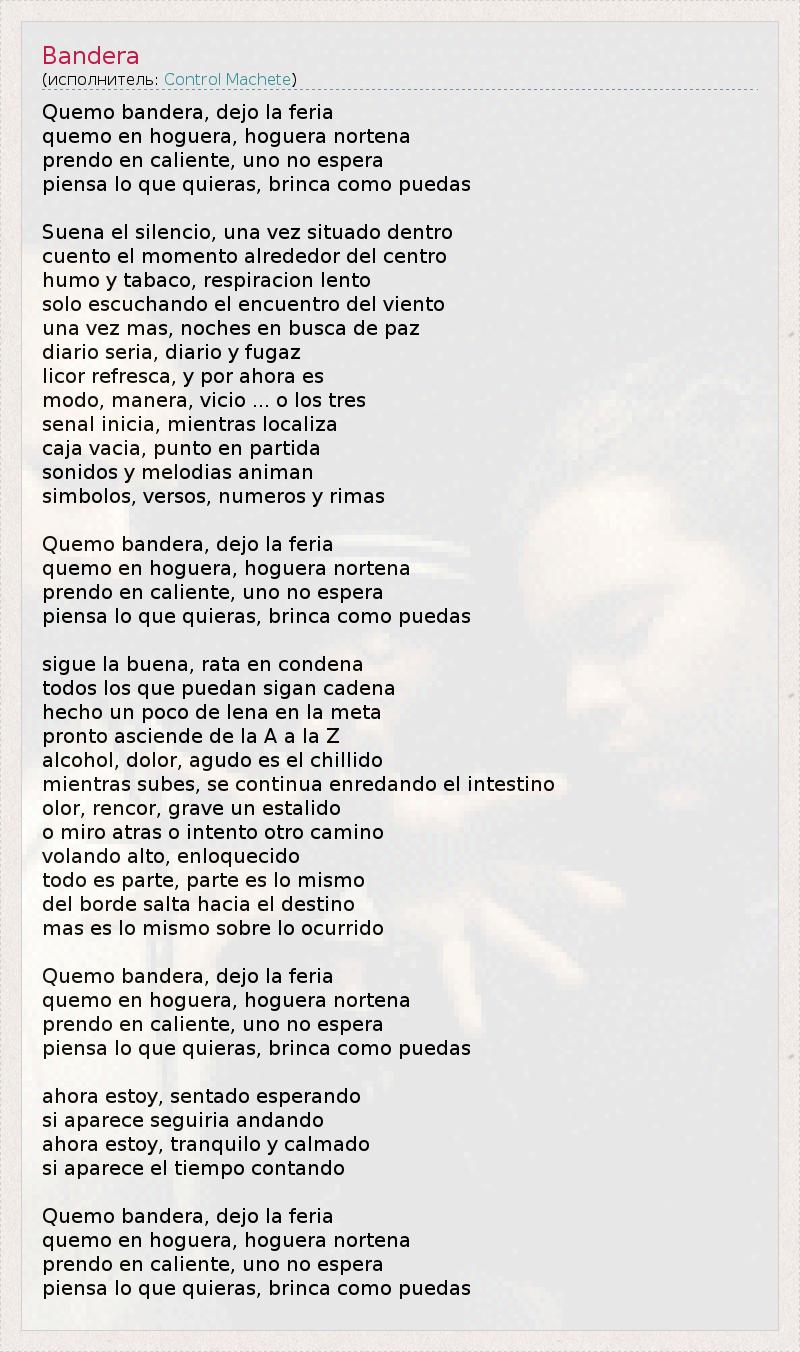 Это интересно:Control Machete – мексиканская хип-хоп-группа из г. Монтеррей, Нуэво-Леон, Мексика. В состав группы входят: Fermin IV, Patricio "Pato" Chapa Elizalde и Toy Kenobi (Toy Hernández). Однако, Fermin IV покинул группу в 2002 году и выпустил сольный альбом – Boomerang. Он также сотрудничал с Cypress Hill в песне "Siempre Peligroso", включенной в альбом Los... продолжение