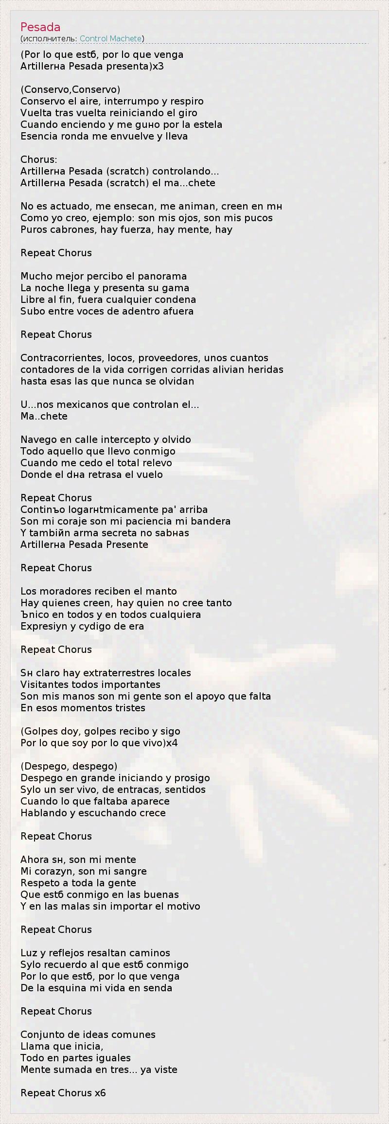 (Por lo que estб, por lo que venga Artillerнa Pesada presenta)x3 (Conservo,Conservo) Conservo el aire, interrumpo y respiro Vuelta tras vuelta reiniciando el giro Cuando enciendo y me guнo por la estela Esencia ronda me envuelve y lleva Chorus: Artillerнa Pesada (scratch) controlando... Artillerнa Pesada (scratch) el ma...chete No es actuado, me enseсan, me animan, creen en mн Como yo creo, ejemplo: son mis ojos, son mis puсos Puros cabrones, hay fuerza, hay mente, hay Repeat Chorus Mucho mejor percibo el panorama La noche llega y presenta su gama Libre al fin, fuera cualquier condena Subo entre voces de adentro afuera Repeat Chorus Contracorrientes, locos, proveedores, unos cuantos contadores de la vida corrigen corridas alivian heridas hasta esas las que nunca se olvidan U...nos mexicanos que controlan el... Ma..chete Navego en calle intercepto y olvido Todo aquello que llevo conmigo Cuando me cedo el total relevo Donde el dнa retrasa el vuelo Repeat Chorus Continъo logarнtmicamente pa' arriba Son mi coraje son mi paciencia mi bandera Y tambiйn arma secreta no sabнas Artillerнa Pesada Presente Repeat Chorus Los moradores reciben el manto Hay quienes creen, hay quien no cree tanto Ъnico en todos y en todos cualquiera Expresiуn y cуdigo de era Repeat Chorus Sн claro hay extraterrestres locales Visitantes todos importantes Son mis manos son mi gente son el apoyo que falta En esos momentos tristes (Golpes doy, golpes recibo y sigo Por lo que soy por lo que vivo)x4 (Despego, despego) Despego en grande iniciando y prosigo Sуlo un ser vivo, de entraсas, sentidos Cuando lo que faltaba aparece Hablando y escuchando crece Repeat Chorus Ahora sн, son mi mente Mi corazуn, son mi sangre Respeto a toda la gente Que estб conmigo en las buenas Y en las malas sin importar el motivo Repeat Chorus Luz y reflejos resaltan caminos Sуlo recuerdo al que estб conmigo Por lo que estб, por lo que venga De la esquina mi vida en senda Repeat Chorus Conjunto de ideas comunes Llama que inicia, Todo en partes iguales Mente sumada en tres... ya viste Repeat Chorus x6