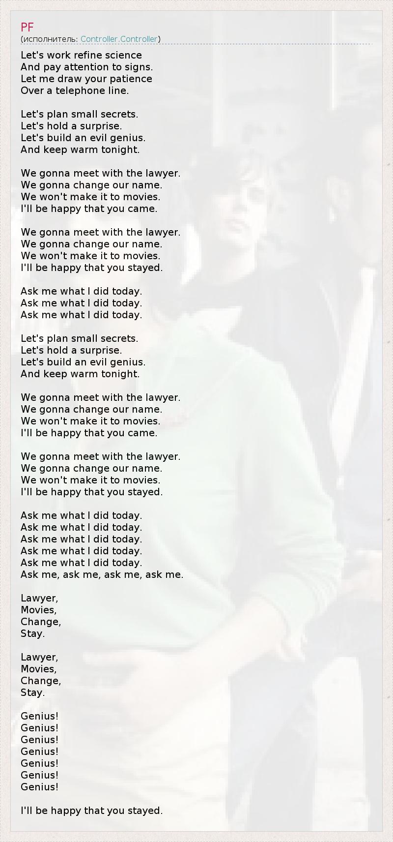 Это интересно:Controller.Controller - канадская инди-рок группа, созданная в 2002 году в Торонто, штат Онтарио. Команда состояла из вокалистки Nirmala Basnayake, гитаристов Colwyn Llewellyn-Thomas и Scott Kaij, басиста Ronnie Morris и барабанщика Jeff Scheven. Название группы взято из композиции Shotmaker.Их ритмичный пост-панковский стиль музыкальные критики сравнивали с Joy Division, The Slits и Public... продолжение