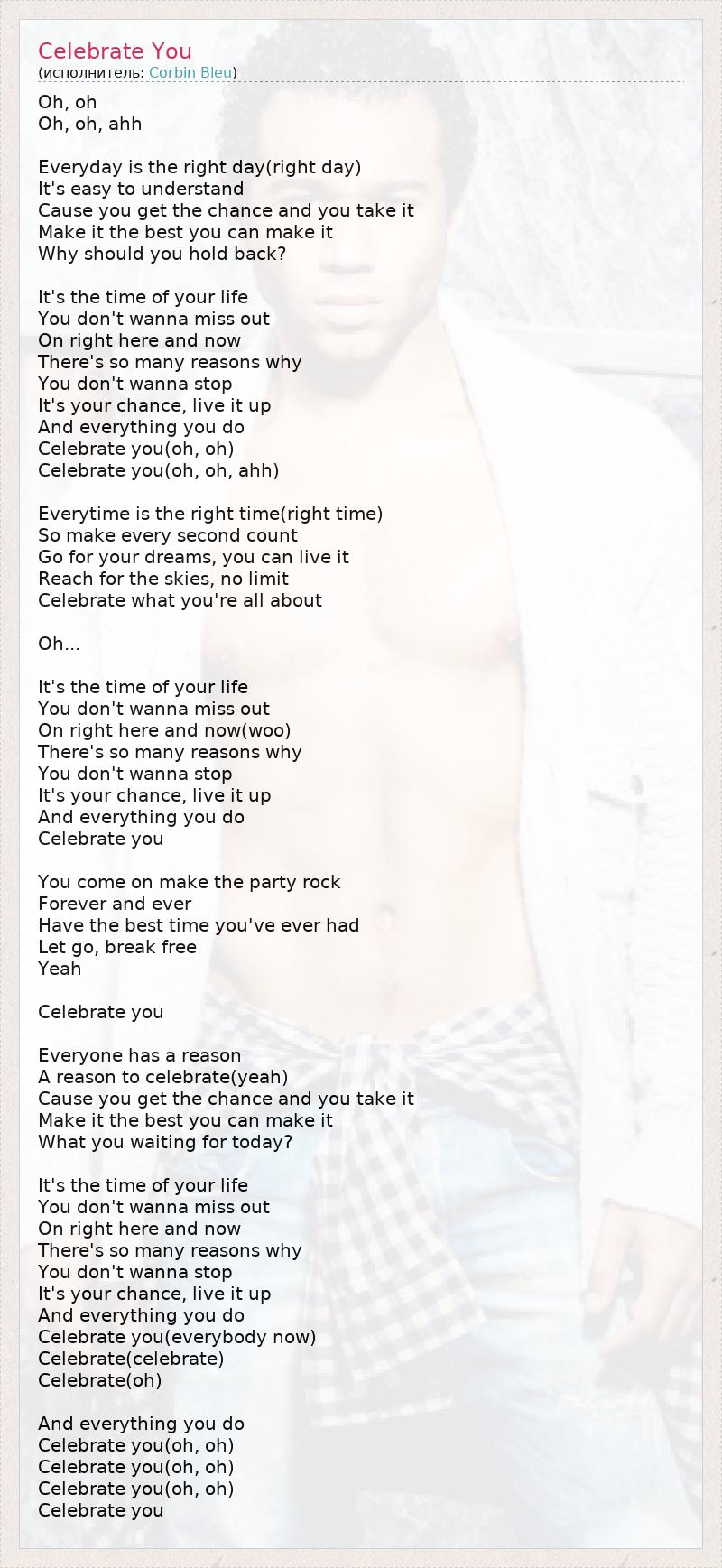 Oh, oh Oh, oh, ahh Everyday is the right day(right day) It's easy to understand Cause you get the chance and you take it Make it the best you can make it Why should you hold back? It's the time of your life You don't wanna miss out On right here and now There's so many reasons why You don't wanna stop It's your chance, live it up And everything you do Celebrate you(oh, oh) Celebrate you(oh, oh, ahh) Everytime is the right time(right time) So make every second count Go for your dreams, you can live it Reach for the skies, no limit Celebrate what you're all about Oh... It's the time of your life You don't wanna miss out On right here and now(woo) There's so many reasons why You don't wanna stop It's your chance, live it up And everything you do Celebrate you You come on make the party rock Forever and ever Have the best time you've ever had Let go, break free Yeah Celebrate you Everyone has a reason A reason to celebrate(yeah) Cause you get the chance and you take it Make it the best you can make it What you waiting for today? It's the time of your life You don't wanna miss out On right here and now There's so many reasons why You don't wanna stop It's your chance, live it up And everything you do Celebrate you(everybody now) Celebrate(celebrate) Celebrate(oh) And everything you do Celebrate you(oh, oh) Celebrate you(oh, oh) Celebrate you(oh, oh) Celebrate you