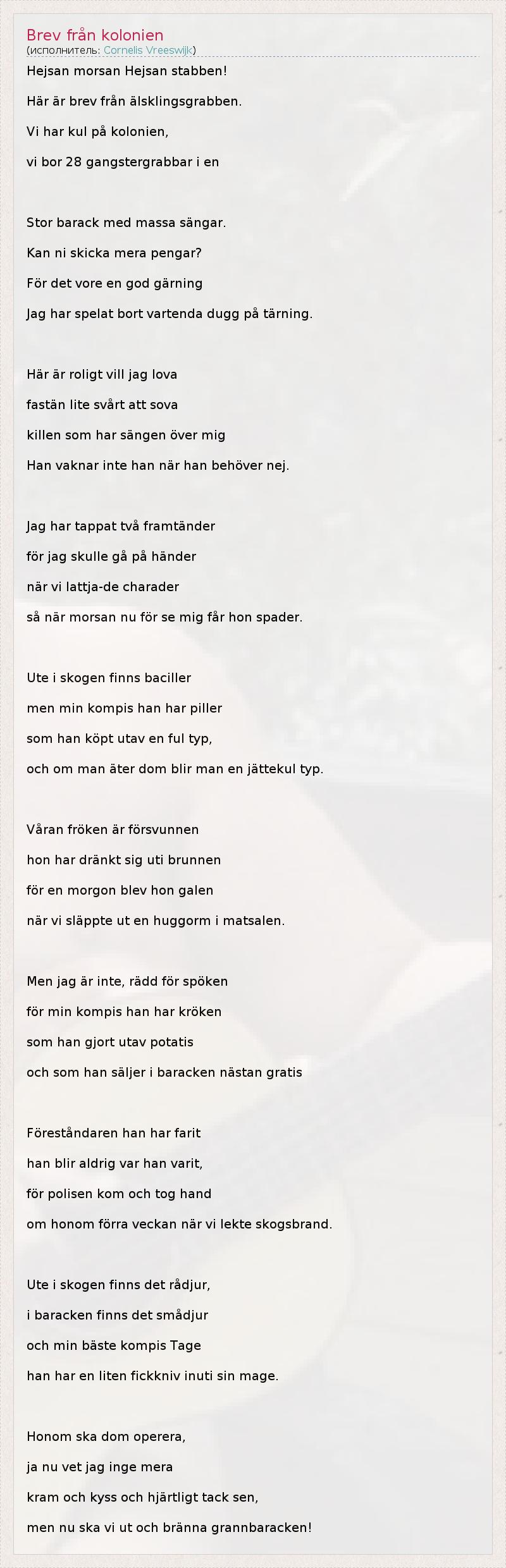 Hejsan morsan Hejsan stabben! Här är brev från älsklingsgrabben. Vi har kul på kolonien, vi bor 28 gangstergrabbar i en Stor barack med massa sängar. Kan ni skicka mera pengar? För det vore en god gärning Jag har spelat bort vartenda dugg på tärning. Här är roligt vill jag lova fastän lite svårt att sova killen som har sängen över mig Han vaknar inte han när han behöver nej. Jag har tappat två framtänder för jag skulle gå på händer när vi lattja-de charader så när morsan nu för se mig får hon spader. Ute i skogen finns baciller men min kompis han har piller som han köpt utav en ful typ, och om man äter dom blir man en jättekul typ. Våran fröken är försvunnen hon har dränkt sig uti brunnen för en morgon blev hon galen när vi släppte ut en huggorm i matsalen. Men jag är inte, rädd för spöken för min kompis han har kröken som han gjort utav potatis och som han säljer i baracken nästan gratis Föreståndaren han har farit han blir aldrig var han varit, för polisen kom och tog hand om honom förra veckan när vi lekte skogsbrand. Ute i skogen finns det rådjur, i baracken finns det smådjur och min bäste kompis Tage han har en liten fickkniv inuti sin mage. Honom ska dom operera, ja nu vet jag inge mera kram och kyss och hjärtligt tack sen, men nu ska vi ut och bränna grannbaracken!