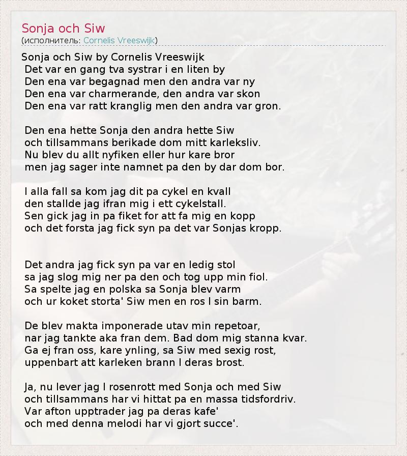 Sonja och Siw by Cornelis Vreeswijk Det var en gang tva systrar i en liten by Den ena var begagnad men den andra var ny Den ena var charmerande, den andra var skon Den ena var ratt kranglig men den andra var gron. Den ena hette Sonja den andra hette Siw och tillsammans berikade dom mitt karleksliv. Nu blev du allt nyfiken eller hur kare bror men jag sager inte namnet pa den by dar dom bor. I alla fall sa kom jag dit pa cykel en kvall den stallde jag ifran mig i ett cykelstall. Sen gick jag in pa fiket for att fa mig en kopp och det forsta jag fick syn pa det var Sonjas kropp. Det andra jag fick syn pa var en ledig stol sa jag slog mig ner pa den och tog upp min fiol. Sa spelte jag en polska sa Sonja blev varm och ur koket storta' Siw men en ros I sin barm. De blev makta imponerade utav min repetoar, nar jag tankte aka fran dem. Bad dom mig stanna kvar. Ga ej fran oss, kare ynling, sa Siw med sexig rost, uppenbart att karleken brann I deras brost. Ja, nu lever jag I rosenrott med Sonja och med Siw och tillsammans har vi hittat pa en massa tidsfordriv. Var afton upptrader jag pa deras kafe' och med denna melodi har vi gjort succe'.