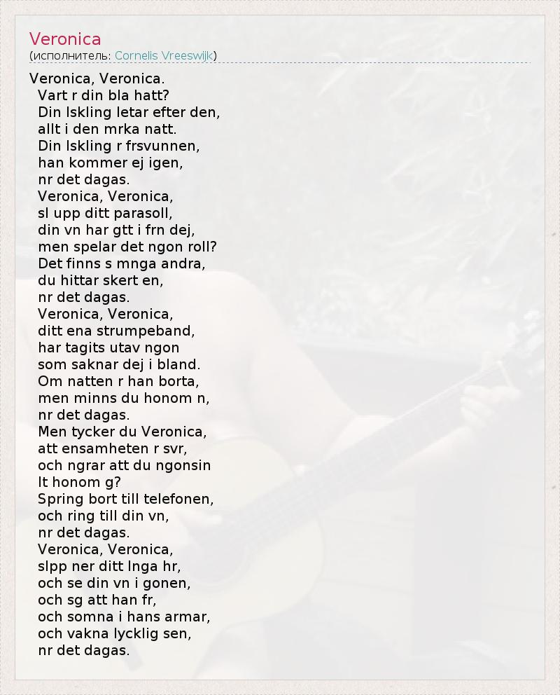 Veronica, Veronica. Vart r din bla hatt? Din lskling letar efter den, allt i den mrka natt. Din lskling r frsvunnen, han kommer ej igen, nr det dagas. Veronica, Veronica, sl upp ditt parasoll, din vn har gtt i frn dej, men spelar det ngon roll? Det finns s mnga andra, du hittar skert en, nr det dagas. Veronica, Veronica, ditt ena strumpeband, har tagits utav ngon som saknar dej i bland. Om natten r han borta, men minns du honom n, nr det dagas. Men tycker du Veronica, att ensamheten r svr, och ngrar att du ngonsin lt honom g? Spring bort till telefonen, och ring till din vn, nr det dagas. Veronica, Veronica, slpp ner ditt lnga hr, och se din vn i gonen, och sg att han fr, och somna i hans armar, och vakna lycklig sen, nr det dagas.