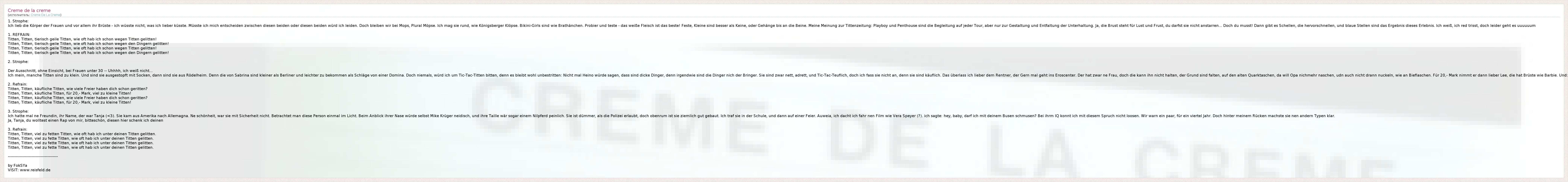 1. Strophe: Ich lieb die Körper der Frauen und vor allem ihr Brüste - ich wüsste nicht, was ich lieber küsste. Müsste ich mich entscheiden zwischen diesen beiden oder diesen beiden würd ich leiden. Doch bleiben wir bei Mops, Plural Möpse. Ich mag sie rund, wie Königsberger Klöpse. Bikini-Girls sind wie Brathänchen. Probier und teste - das weiße Fleisch ist das beste! Feste, Kleine sind besser als Keine, oder Gehänge bis an die Beine. Meine Meinung zur Tittenzeitung: Playboy und Penthouse sind die Begleitung auf jeder Tour, aber nur zur Gestaltung und Entfaltung der Unterhaltung. Ja, die Brust steht für Lust und Frust, du darfst sie nicht anstarren... Doch du musst! Dann gibt es Schellen, die hervorschnellen, und blaue Stellen sind das Ergebnis dieses Erlebnis. Ich weiß, ich red trisst, doch leider geht es uuuuuum 1. REFRAIN: Titten, Titten, tierisch geile Titten, wie oft hab ich schon wegen Titten gelitten! Titten, Titten, tierisch geile Titten, wie oft hab ich schon wegen den Dingern gelitten! Titten, Titten, tierisch geile Titten, wie oft hab ich schon wegen Titten gelitten! Titten, Titten, tierisch geile Titten, wie oft hab ich schon wegen den Dingern gelitten! 2. Strophe: Der Ausschnitt, ohne Einsicht, bei Frauen unter 30 -- Uhhhh, ich weiß nicht... Ich mein, manche Titten sind zu klein. Und sind sie ausgestopft mit Socken, dann sind sie aus Rödelheim. Denn die von Sabrina sind kleiner als Berliner und leichter zu bekommen als Schläge von einer Domina. Doch niemals, würd ich um Tic-Tac-Titten bitten, denn es bleibt wohl unbestritten: Nicht mal Heino würde sagen, dass sind dicke Dinger, denn irgendwie sind die Dinger nich der Bringer. Sie sind zwar nett, adrett, und Tic-Tac-Teuflich, doch ich fass sie nicht an, denn sie sind käuflich. Das überlass ich lieber dem Rentner, der Gern mal geht ins Eroscenter. Der hat zwar ne Frau, doch die kann ihn nicht halten, der Grund sind falten, auf den alten Quarktaschen, da will Opa nichmehr naschen, udn auch nicht drann nuckeln, wie an Bieflaschen. Für 20,- Mark nimmt er dann lieber Lee, die hat Brüste wie Barbie. Und: 2. Refrain: Titten, Titten, käufliche Titten, wie viele Freier haben dich schon geritten? Titten, Titten, käufliche Titten, für 20,- Mark, viel zu kleine Titten! Titten, Titten, käufliche Titten, wie viele Freier haben dich schon geritten? Titten, Titten, käufliche Titten, für 20,- Mark, viel zu kleine Titten! 3. Strophe: Ich hatte mal ne Freundin, ihr Name, der war Tanja (<3). Sie kam aus Amerika nach Allemagna. Ne schönheit, war sie mit Sicherheit nicht. Betrachtet man diese Person einmal im Licht. Beim Anblick ihrer Nase würde selbst Mike Krüger neidisch, und ihre Taille wär sogar einem Nilpferd peinlich. Sie ist dümmer, als die Polizei erlaubt, doch obenrum ist sie ziemlich gut gebaut. Ich traf sie in der Schule, und dann auf einer Feier. Auweia, ich dacht ich fahr nen Film wie Vera Speyer (?). ich sagte: hey, baby, darf ich mit deinem Busen schmusen? Bei ihrm IQ konnt ich mit diesem Spruch nicht loosen. Wir warn ein paar, für ein viertel Jahr. Doch hinter meinem Rücken machste sie nen andern Typen klar. Ja, Tanja, du wolltest einen Rap von mir, bitteschön, diesen hier schenk ich deinen 3. Refrain: Titten, Titten, viel zu fetten Titten, wie oft hab ich unter deinen Titten gelitten. Titten, Titten, viel zu fette Titten, wie oft hab ich unter deinen Titten gelitten. Titten, Titten, viel zu fette Titten, wie oft hab ich unter deinen Titten gelitten. Titten, Titten, viel zu fette Titten, wie oft hab ich unter deinen Titten gelitten. -------------------------------------- by FokSYa VISIT: www.reisfeld.de
