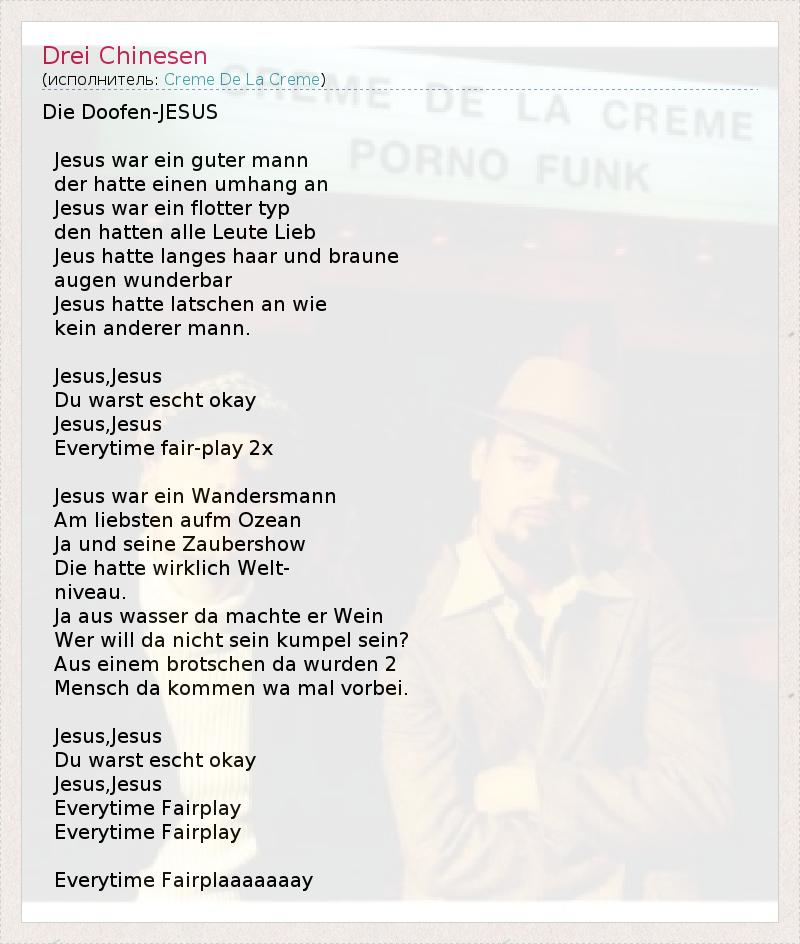 Die Doofen-JESUS Jesus war ein guter mann der hatte einen umhang an Jesus war ein flotter typ den hatten alle Leute Lieb Jeus hatte langes haar und braune augen wunderbar Jesus hatte latschen an wie kein anderer mann. Jesus,Jesus Du warst escht okay Jesus,Jesus Everytime fair-play 2x Jesus war ein Wandersmann Am liebsten aufm Ozean Ja und seine Zaubershow Die hatte wirklich Welt- niveau. Ja aus wasser da machte er Wein Wer will da nicht sein kumpel sein? Aus einem brotschen da wurden 2 Mensch da kommen wa mal vorbei. Jesus,Jesus Du warst escht okay Jesus,Jesus Everytime Fairplay Everytime Fairplay Everytime Fairplaaaaaaay