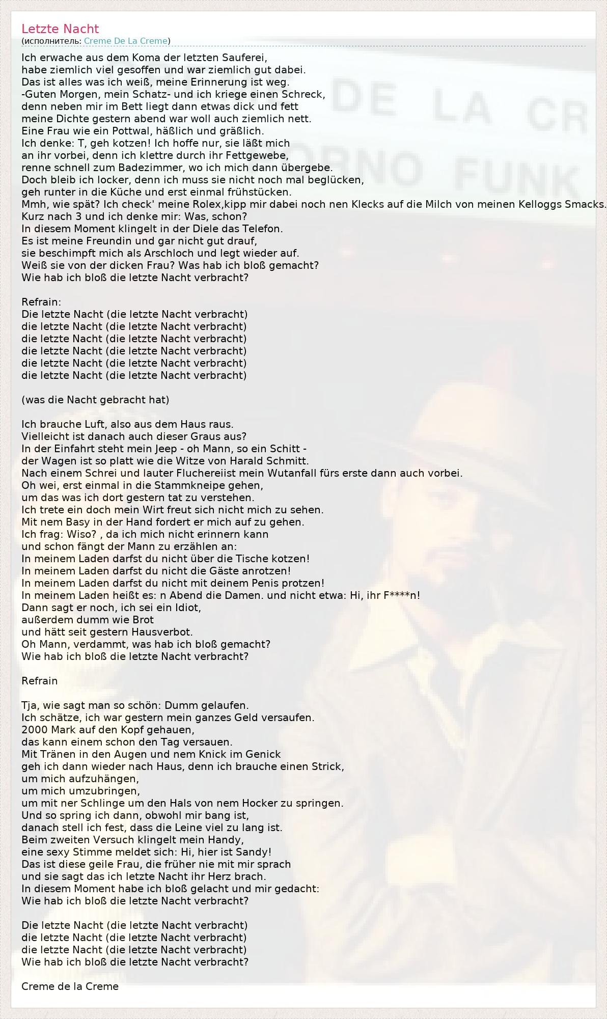 Ich erwache aus dem Koma der letzten Sauferei, habe ziemlich viel gesoffen und war ziemlich gut dabei. Das ist alles was ich weiß, meine Erinnerung ist weg. -Guten Morgen, mein Schatz- und ich kriege einen Schreck, denn neben mir im Bett liegt dann etwas dick und fett meine Dichte gestern abend war woll auch ziemlich nett. Eine Frau wie ein Pottwal, häßlich und gräßlich. Ich denke: T, geh kotzen! Ich hoffe nur, sie läßt mich an ihr vorbei, denn ich klettre durch ihr Fettgewebe, renne schnell zum Badezimmer, wo ich mich dann übergebe. Doch bleib ich locker, denn ich muss sie nicht noch mal beglücken, geh runter in die Küche und erst einmal frühstücken. Mmh, wie spät? Ich check' meine Rolex,kipp mir dabei noch nen Klecks auf die Milch von meinen Kelloggs Smacks. Kurz nach 3 und ich denke mir: Was, schon? In diesem Moment klingelt in der Diele das Telefon. Es ist meine Freundin und gar nicht gut drauf, sie beschimpft mich als Arschloch und legt wieder auf. Weiß sie von der dicken Frau? Was hab ich bloß gemacht? Wie hab ich bloß die letzte Nacht verbracht? Refrain: Die letzte Nacht (die letzte Nacht verbracht) die letzte Nacht (die letzte Nacht verbracht) die letzte Nacht (die letzte Nacht verbracht) die letzte Nacht (die letzte Nacht verbracht) die letzte Nacht (die letzte Nacht verbracht) die letzte Nacht (die letzte Nacht verbracht) (was die Nacht gebracht hat) Ich brauche Luft, also aus dem Haus raus. Vielleicht ist danach auch dieser Graus aus? In der Einfahrt steht mein Jeep - oh Mann, so ein Schitt - der Wagen ist so platt wie die Witze von Harald Schmitt. Nach einem Schrei und lauter Fluchereiist mein Wutanfall fürs erste dann auch vorbei. Oh wei, erst einmal in die Stammkneipe gehen, um das was ich dort gestern tat zu verstehen. Ich trete ein doch mein Wirt freut sich nicht mich zu sehen. Mit nem Basy in der Hand fordert er mich auf zu gehen. Ich frag: Wiso? , da ich mich nicht erinnern kann und schon fängt der Mann zu erzählen an: In meinem Laden darfst du nicht über die Tische kotzen! In meinem Laden darfst du nicht die Gäste anrotzen! In meinem Laden darfst du nicht mit deinem Penis protzen! In meinem Laden heißt es: n Abend die Damen. und nicht etwa: Hi, ihr F****n! Dann sagt er noch, ich sei ein Idiot, außerdem dumm wie Brot und hätt seit gestern Hausverbot. Oh Mann, verdammt, was hab ich bloß gemacht? Wie hab ich bloß die letzte Nacht verbracht? Refrain Tja, wie sagt man so schön: Dumm gelaufen. Ich schätze, ich war gestern mein ganzes Geld versaufen. 2000 Mark auf den Kopf gehauen, das kann einem schon den Tag versauen. Mit Tränen in den Augen und nem Knick im Genick geh ich dann wieder nach Haus, denn ich brauche einen Strick, um mich aufzuhängen, um mich umzubringen, um mit ner Schlinge um den Hals von nem Hocker zu springen. Und so spring ich dann, obwohl mir bang ist, danach stell ich fest, dass die Leine viel zu lang ist. Beim zweiten Versuch klingelt mein Handy, eine sexy Stimme meldet sich: Hi, hier ist Sandy! Das ist diese geile Frau, die früher nie mit mir sprach und sie sagt das ich letzte Nacht ihr Herz brach. In diesem Moment habe ich bloß gelacht und mir gedacht: Wie hab ich bloß die letzte Nacht verbracht? Die letzte Nacht (die letzte Nacht verbracht) die letzte Nacht (die letzte Nacht verbracht) die letzte Nacht (die letzte Nacht verbracht) Wie hab ich bloß die letzte Nacht verbracht? Creme de la Creme
