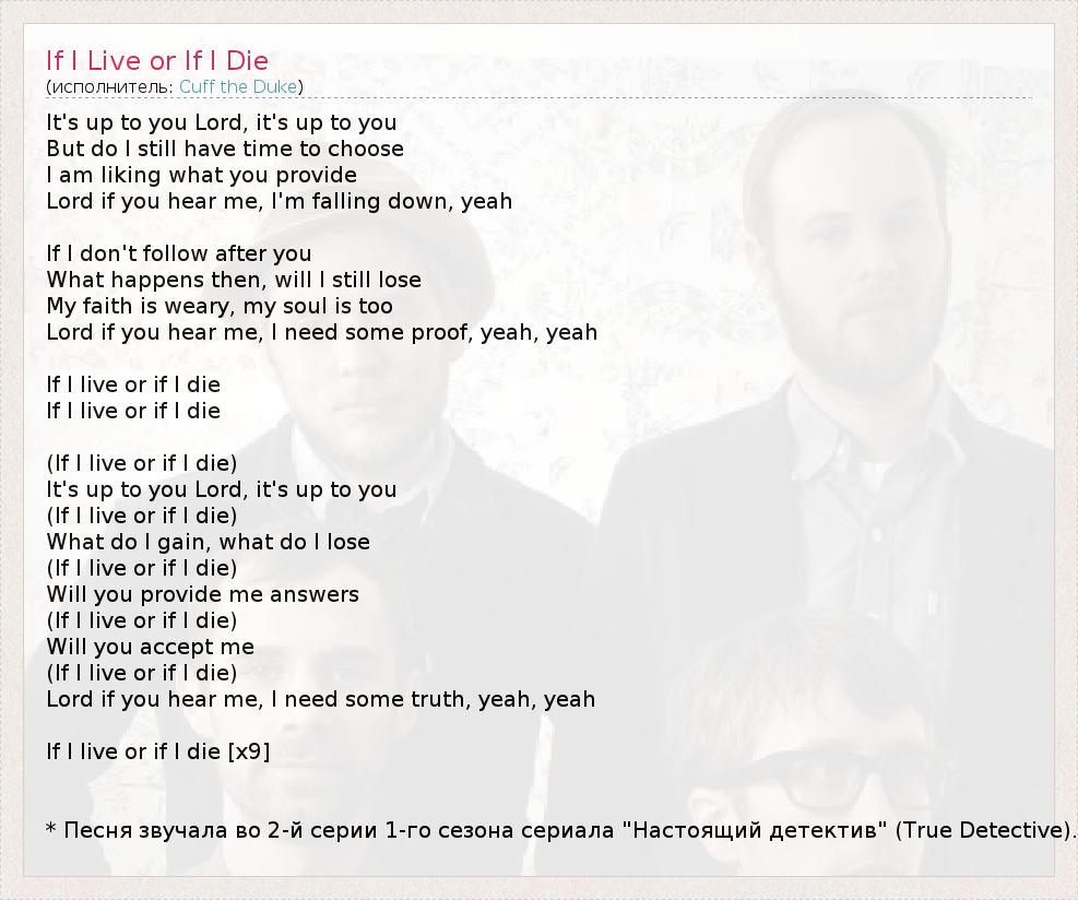 It's up to you Lord, it's up to you But do I still have time to choose I am liking what you provide Lord if you hear me, I'm falling down, yeah If I don't follow after you What happens then, will I still lose My faith is weary, my soul is too Lord if you hear me, I need some proof, yeah, yeah If I live or if I die If I live or if I die (If I live or if I die) It's up to you Lord, it's up to you (If I live or if I die) What do I gain, what do I lose (If I live or if I die) Will you provide me answers (If I live or if I die) Will you accept me (If I live or if I die) Lord if you hear me, I need some truth, yeah, yeah If I live or if I die [x9] * Песня звучала во 2-й серии 1-го сезона сериала "Настоящий детектив" (True Detective).