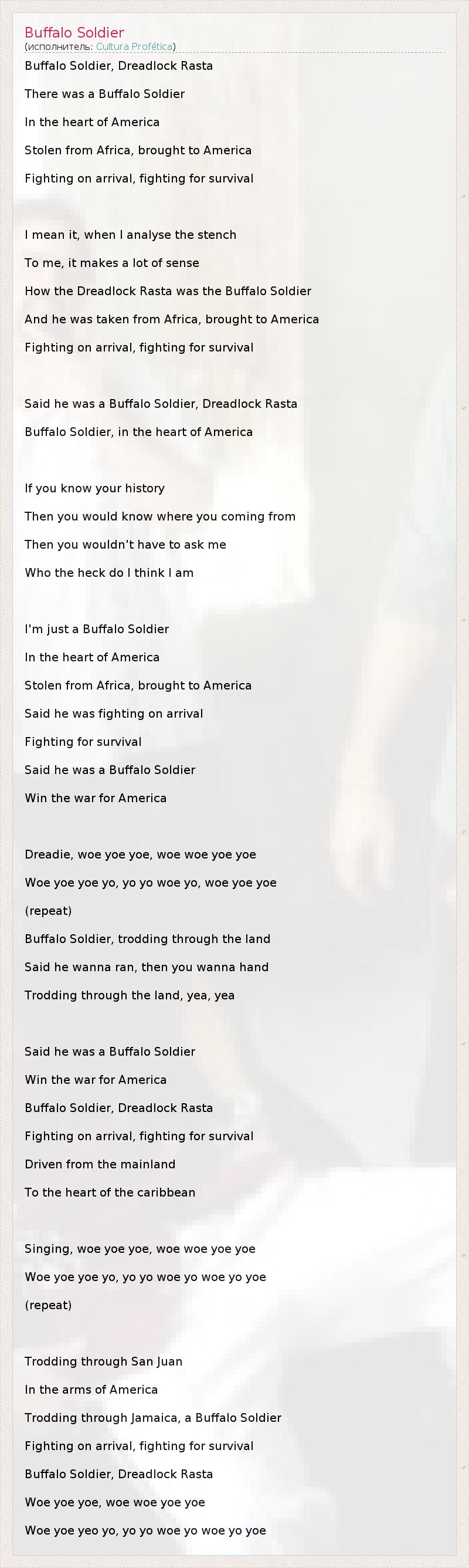 Buffalo Soldier, Dreadlock Rasta There was a Buffalo Soldier In the heart of America Stolen from Africa, brought to America Fighting on arrival, fighting for survival I mean it, when I analyse the stench To me, it makes a lot of sense How the Dreadlock Rasta was the Buffalo Soldier And he was taken from Africa, brought to America Fighting on arrival, fighting for survival Said he was a Buffalo Soldier, Dreadlock Rasta Buffalo Soldier, in the heart of America If you know your history Then you would know where you coming from Then you wouldn't have to ask me Who the heck do I think I am I'm just a Buffalo Soldier In the heart of America Stolen from Africa, brought to America Said he was fighting on arrival Fighting for survival Said he was a Buffalo Soldier Win the war for America Dreadie, woe yoe yoe, woe woe yoe yoe Woe yoe yoe yo, yo yo woe yo, woe yoe yoe (repeat) Buffalo Soldier, trodding through the land Said he wanna ran, then you wanna hand Trodding through the land, yea, yea Said he was a Buffalo Soldier Win the war for America Buffalo Soldier, Dreadlock Rasta Fighting on arrival, fighting for survival Driven from the mainland To the heart of the caribbean Singing, woe yoe yoe, woe woe yoe yoe Woe yoe yoe yo, yo yo woe yo woe yo yoe (repeat) Trodding through San Juan In the arms of America Trodding through Jamaica, a Buffalo Soldier Fighting on arrival, fighting for survival Buffalo Soldier, Dreadlock Rasta Woe yoe yoe, woe woe yoe yoe Woe yoe yeo yo, yo yo woe yo woe yo yoe