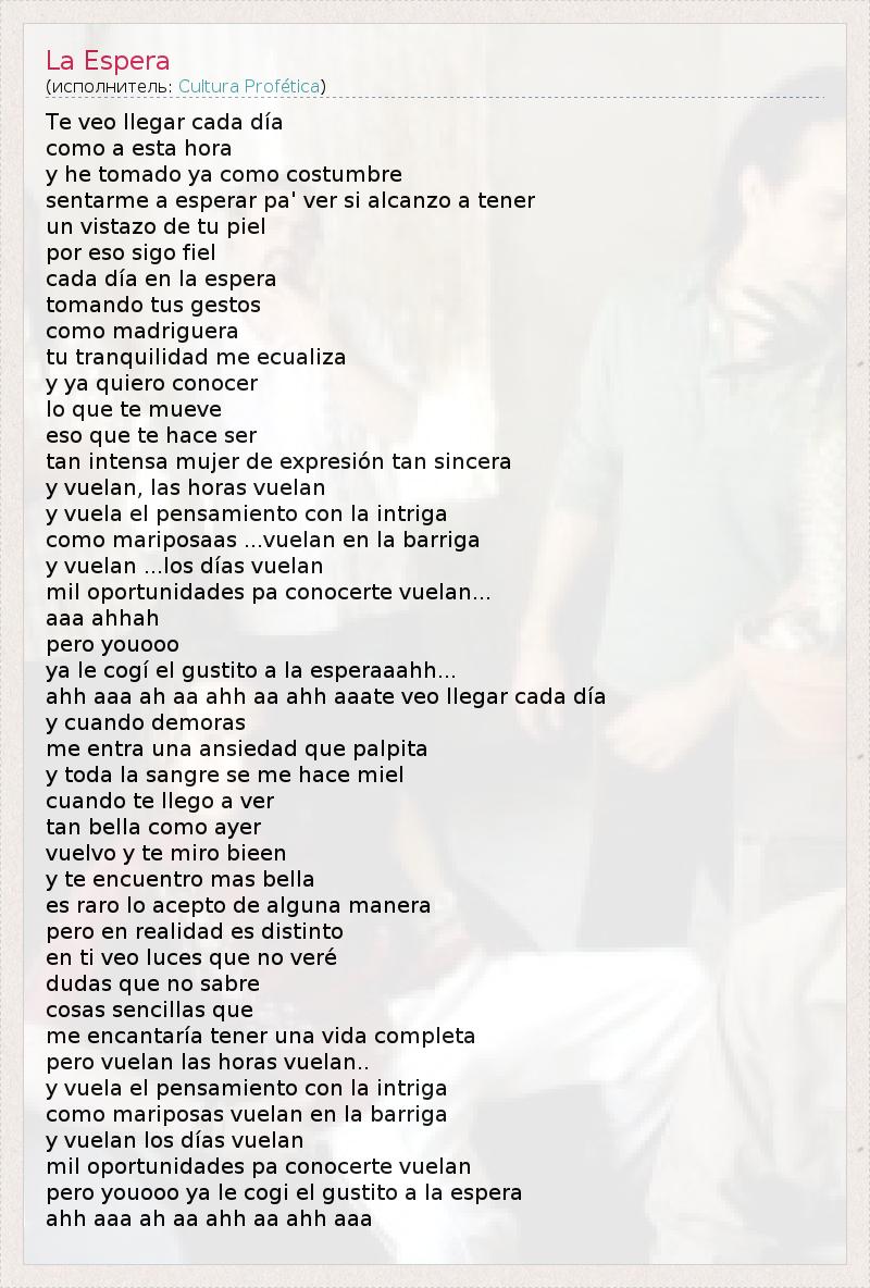 Te veo llegar cada día como a esta hora y he tomado ya como costumbre sentarme a esperar pa' ver si alcanzo a tener un vistazo de tu piel por eso sigo fiel cada día en la espera tomando tus gestos como madriguera tu tranquilidad me ecualiza y ya quiero conocer lo que te mueve eso que te hace ser tan intensa mujer de expresión tan sincera y vuelan, las horas vuelan y vuela el pensamiento con la intriga como mariposaas ...vuelan en la barriga y vuelan ...los días vuelan mil oportunidades pa conocerte vuelan... aaa ahhah pero youooo ya le cogí el gustito a la esperaaahh... ahh aaa ah aa ahh aa ahh aaate veo llegar cada día y cuando demoras me entra una ansiedad que palpita y toda la sangre se me hace miel cuando te llego a ver tan bella como ayer vuelvo y te miro bieen y te encuentro mas bella es raro lo acepto de alguna manera pero en realidad es distinto en ti veo luces que no veré dudas que no sabre cosas sencillas que me encantaría tener una vida completa pero vuelan las horas vuelan.. y vuela el pensamiento con la intriga como mariposas vuelan en la barriga y vuelan los días vuelan mil oportunidades pa conocerte vuelan pero youooo ya le cogi el gustito a la espera ahh aaa ah aa ahh aa ahh aaa