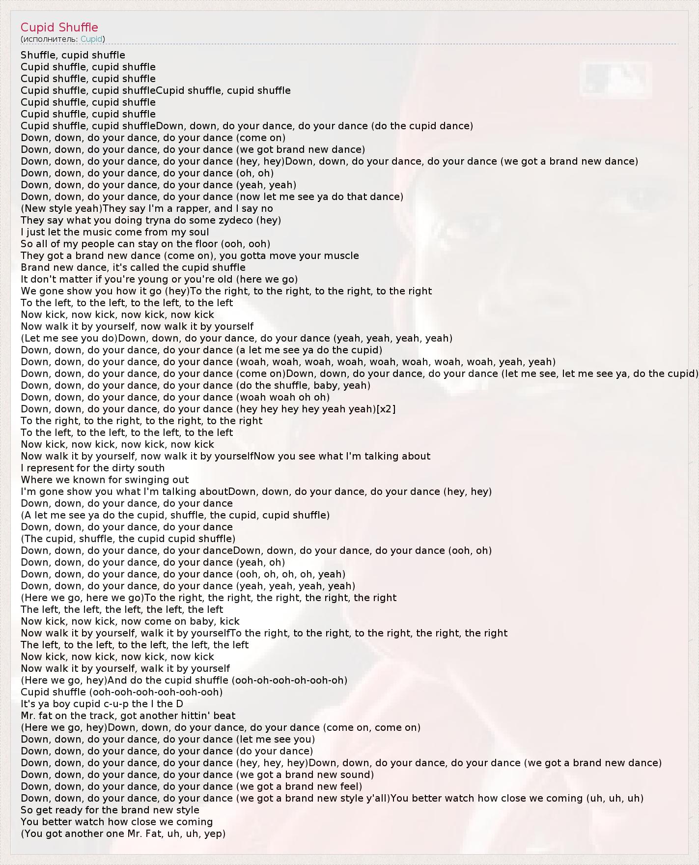 Shuffle, cupid shuffle Cupid shuffle, cupid shuffle Cupid shuffle, cupid shuffle Cupid shuffle, cupid shuffleCupid shuffle, cupid shuffle Cupid shuffle, cupid shuffle Cupid shuffle, cupid shuffle Cupid shuffle, cupid shuffleDown, down, do your dance, do your dance (do the cupid dance) Down, down, do your dance, do your dance (come on) Down, down, do your dance, do your dance (we got brand new dance) Down, down, do your dance, do your dance (hey, hey)Down, down, do your dance, do your dance (we got a brand new dance) Down, down, do your dance, do your dance (oh, oh) Down, down, do your dance, do your dance (yeah, yeah) Down, down, do your dance, do your dance (now let me see ya do that dance) (New style yeah)They say I'm a rapper, and I say no They say what you doing tryna do some zydeco (hey) I just let the music come from my soul So all of my people can stay on the floor (ooh, ooh) They got a brand new dance (come on), you gotta move your muscle Brand new dance, it's called the cupid shuffle It don't matter if you're young or you're old (here we go) We gone show you how it go (hey)To the right, to the right, to the right, to the right To the left, to the left, to the left, to the left Now kick, now kick, now kick, now kick Now walk it by yourself, now walk it by yourself (Let me see you do)Down, down, do your dance, do your dance (yeah, yeah, yeah, yeah) Down, down, do your dance, do your dance (a let me see ya do the cupid) Down, down, do your dance, do your dance (woah, woah, woah, woah, woah, woah, woah, woah, yeah, yeah) Down, down, do your dance, do your dance (come on)Down, down, do your dance, do your dance (let me see, let me see ya, do the cupid) Down, down, do your dance, do your dance (do the shuffle, baby, yeah) Down, down, do your dance, do your dance (woah woah oh oh) Down, down, do your dance, do your dance (hey hey hey hey yeah yeah)[x2] To the right, to the right, to the right, to the right To the left, to the left, to the left, to the left Now kick, now kick, now kick, now kick Now walk it by yourself, now walk it by yourselfNow you see what I'm talking about I represent for the dirty south Where we known for swinging out I'm gone show you what I'm talking aboutDown, down, do your dance, do your dance (hey, hey) Down, down, do your dance, do your dance (A let me see ya do the cupid, shuffle, the cupid, cupid shuffle) Down, down, do your dance, do your dance (The cupid, shuffle, the cupid cupid shuffle) Down, down, do your dance, do your danceDown, down, do your dance, do your dance (ooh, oh) Down, down, do your dance, do your dance (yeah, oh) Down, down, do your dance, do your dance (ooh, oh, oh, oh, yeah) Down, down, do your dance, do your dance (yeah, yeah, yeah, yeah) (Here we go, here we go)To the right, the right, the right, the right, the right The left, the left, the left, the left, the left Now kick, now kick, now come on baby, kick Now walk it by yourself, walk it by yourselfTo the right, to the right, to the right, the right, the right The left, to the left, to the left, the left, the left Now kick, now kick, now kick, now kick Now walk it by yourself, walk it by yourself (Here we go, hey)And do the cupid shuffle (ooh-oh-ooh-oh-ooh-oh) Cupid shuffle (ooh-ooh-ooh-ooh-ooh-ooh) It's ya boy cupid c-u-p the I the D Mr. fat on the track, got another hittin' beat (Here we go, hey)Down, down, do your dance, do your dance (come on, come on) Down, down, do your dance, do your dance (let me see you) Down, down, do your dance, do your dance (do your dance) Down, down, do your dance, do your dance (hey, hey, hey)Down, down, do your dance, do your dance (we got a brand new dance) Down, down, do your dance, do your dance (we got a brand new sound) Down, down, do your dance, do your dance (we got a brand new feel) Down, down, do your dance, do your dance (we got a brand new style y'all)You better watch how close we coming (uh, uh, uh) So get ready for the brand new style You better watch how close we coming (You got another one Mr. Fat, uh, uh, yep)