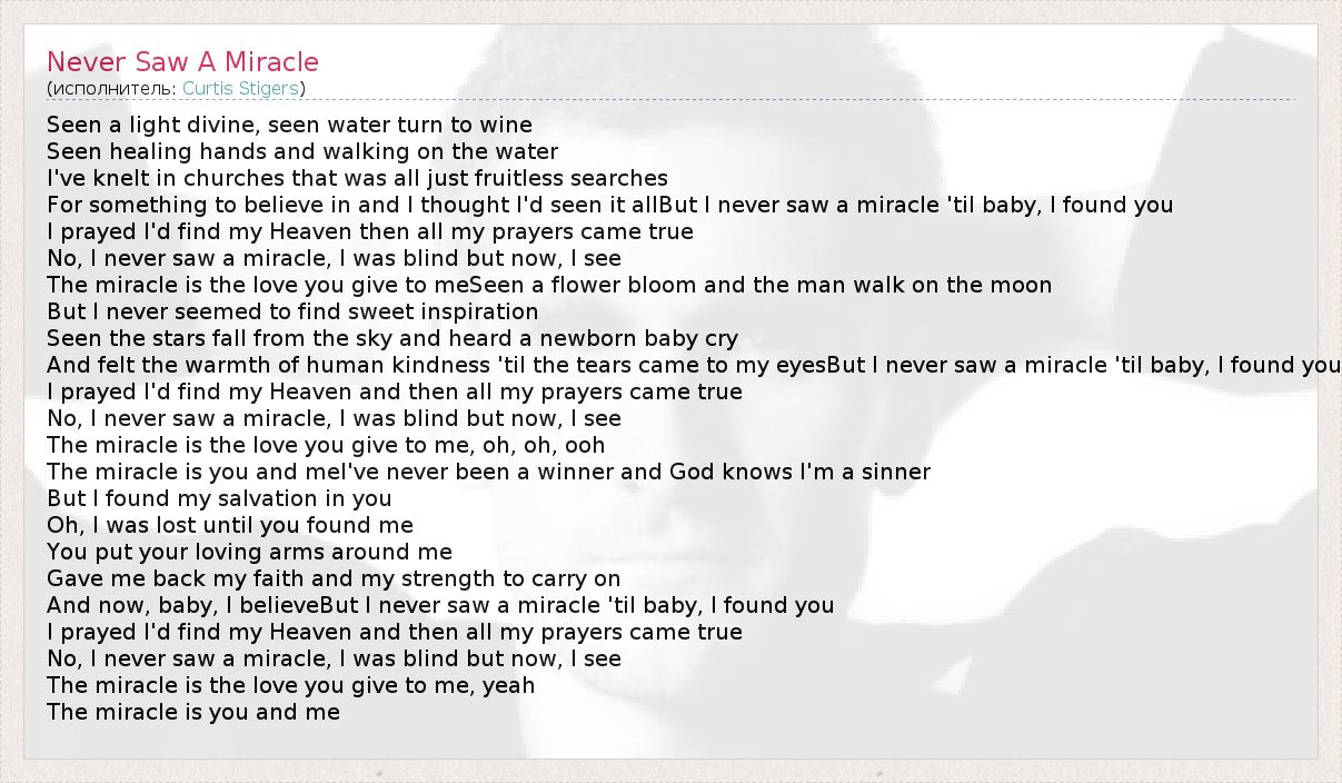 Seen a light divine, seen water turn to wine Seen healing hands and walking on the water I've knelt in churches that was all just fruitless searches For something to believe in and I thought I'd seen it allBut I never saw a miracle 'til baby, I found you I prayed I'd find my Heaven then all my prayers came true No, I never saw a miracle, I was blind but now, I see The miracle is the love you give to meSeen a flower bloom and the man walk on the moon But I never seemed to find sweet inspiration Seen the stars fall from the sky and heard a newborn baby cry And felt the warmth of human kindness 'til the tears came to my eyesBut I never saw a miracle 'til baby, I found you I prayed I'd find my Heaven and then all my prayers came true No, I never saw a miracle, I was blind but now, I see The miracle is the love you give to me, oh, oh, ooh The miracle is you and meI've never been a winner and God knows I'm a sinner But I found my salvation in you Oh, I was lost until you found me You put your loving arms around me Gave me back my faith and my strength to carry on And now, baby, I believeBut I never saw a miracle 'til baby, I found you I prayed I'd find my Heaven and then all my prayers came true No, I never saw a miracle, I was blind but now, I see The miracle is the love you give to me, yeah The miracle is you and me