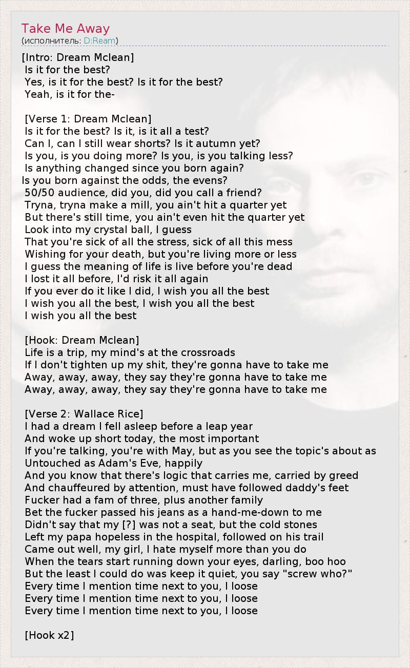 [Вступление: Dream Маклин] Является ли это для лучше? Да, это и к лучшему? Является ли это для лучше? Да, это для тео- [Стих 1: Dream Маклин] Является ли это для лучше? Это, это все испытания? Могу ли я, могу ли я носить шорты? Это осень еще? Это вы, это вы делаете больше? Это вы, это вы меньше говорить? Что-нибудь изменилось ли, так как вы рождены свыше? Является вы родились, вопреки всему, эвенов? 50/50 аудитория, ты, ты назвал другом? Tryna, делаю, сделать мельницу, вы не ударил четверть еще Но еще есть время, вы даже не попал в квартал еще Посмотрите на мой хрустальный шар, я думаю, Что вы устали от всех стрессов, надоело все это безобразие Желая вашей смерти, но ты живешь более или менее Я думаю, смысл жизни в прямом эфире, прежде чем вы мертвы Я потерял все это раньше, я бы рисковать все это снова Если вы когда-нибудь сделать это, как я сделал, я желаю вам всего наилучшего Я желаю вам всего самого наилучшего, я желаю вам всего наилучшего Всего наилучшего [Припев: Dream Маклин] Жизнь поездка, мой ум на перекрестке Если бы я не затягивайте до мое дерьмо, что они собираются иметь, чтобы взять меня Прочь, прочь, прочь, они говорят, что они собираются должны взять меня Прочь, прочь, прочь, они говорят, что они собираются должны взять меня [Куплет 2: Уоллес Райс] Мне приснился сон, я заснул перед високосный год И проснулся короткие сегодня, наиболее важным Если вы говорите, что вы с мая, но, как вы видите раздела о качестве Нетронутая как Ева Адама, к счастью, И вы знаете, что есть логика, которая несет меня, несут жадности И с водителем вниманием, должно быть, с последующим ноги папины Fucker было FAM из трех, плюс еще семью Ставка ублюдок сдал джинс как ручной меня вниз мне Не сказать, что моя [?] Не было места, но холодные камни Слева мой папа безнадежно в больнице, а затем на его след Вышел хорошо, моя девочка, я ненавижу себя больше, чем вы Когда слезы начать текли глаза, дорогая, бу гу Но что я мог сделать, это держать это в тайне, вы говорите, и Quot; винт, который и Quot?; Каждый раз, когда я упоминаю время рядом с вами, я освобождаю Каждый раз, когда я упоминаю время рядом с вами, я освобождаю Каждый раз, когда я упоминаю время рядом с вами, я освобождаю [Припев x2]