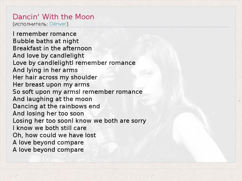 I remember romance Bubble baths at night Breakfast in the afternoon And love by candlelight Love by candlelightI remember romance And lying in her arms Her hair across my shoulder Her breast upon my arms So soft upon my armsI remember romance And laughing at the moon Dancing at the rainbows end And losing her too soon Losing her too soonI know we both are sorry I know we both still care Oh, how could we have lost A love beyond compare A love beyond compare