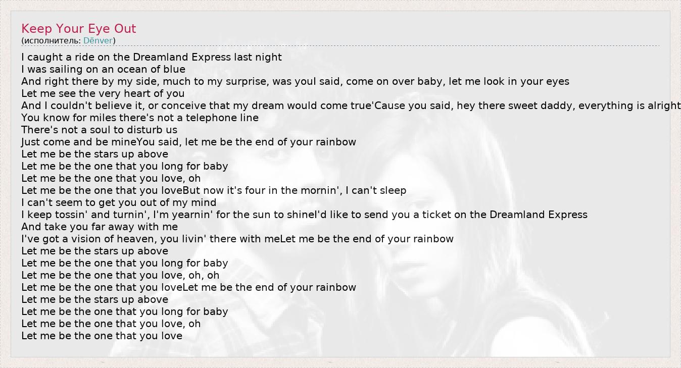 I caught a ride on the Dreamland Express last night I was sailing on an ocean of blue And right there by my side, much to my surprise, was youI said, come on over baby, let me look in your eyes Let me see the very heart of you And I couldn't believe it, or conceive that my dream would come true'Cause you said, hey there sweet daddy, everything is alright You know for miles there's not a telephone line There's not a soul to disturb us Just come and be mineYou said, let me be the end of your rainbow Let me be the stars up above Let me be the one that you long for baby Let me be the one that you love, oh Let me be the one that you loveBut now it's four in the mornin', I can't sleep I can't seem to get you out of my mind I keep tossin' and turnin', I'm yearnin' for the sun to shineI'd like to send you a ticket on the Dreamland Express And take you far away with me I've got a vision of heaven, you livin' there with meLet me be the end of your rainbow Let me be the stars up above Let me be the one that you long for baby Let me be the one that you love, oh, oh Let me be the one that you loveLet me be the end of your rainbow Let me be the stars up above Let me be the one that you long for baby Let me be the one that you love, oh Let me be the one that you love