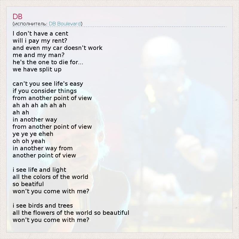 I don't have a cent will i pay my rent? and even my car doesn't work me and my man? he's the one to die for... we have split up can't you see life's easy if you consider things from another point of view ah ah ah ah ah ah ah ah in another way from another point of view ye ye ye eheh oh oh yeah in another way from another point of view i see life and light all the colors of the world so beatiful won't you come with me? i see birds and trees all the flowers of the world so beautiful won't you come with me?