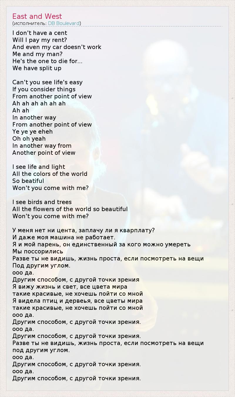I don't have a cent Will I pay my rent? And even my car doesn't work Me and my man? He's the one to die for... We have split up Can't you see life's easy If you consider things From another point of view Ah ah ah ah ah ah Ah ah In another way From another point of view Ye ye ye eheh Oh oh yeah In another way from Another point of view I see life and light All the colors of the world So beatiful Won't you come with me? I see birds and trees All the flowers of the world so beautiful Won't you come with me? У меня нет ни цента, заплачу ли я кварплату? И даже моя машина не работает. Я и мой парень, он единственный за кого можно умереть Мы поссорились Разве ты не видишь, жизнь проста, если посмотреть на вещи Под другим углом. ооо да. Другим способом, с другой точки зрения Я вижу жизнь и свет, все цвета мира такие красивые, не хочешь пойти со мной Я видела птиц и дервеья, все цветы мира такие красивые, не хочешь пойти со мной ооо да. Другим способом, с другой точки зрения. ооо да. Другим способом, с другой точки зрения. Разве ты не видишь, жизнь проста, если посмотреть на вещи под другим углом. ооо да. Другим способом, с другой точки зрения. ооо да. Другим способом, с другой точки зрения.