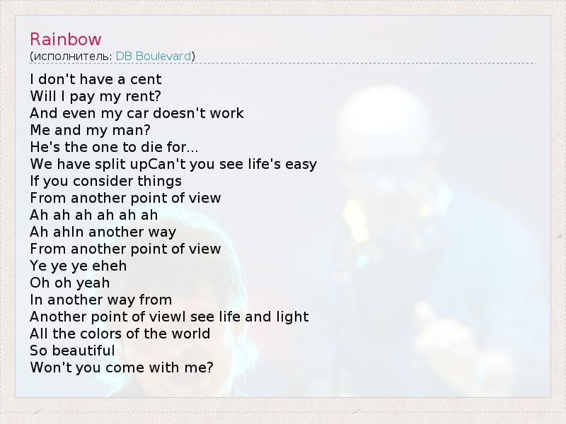 I don't have a cent Will I pay my rent? And even my car doesn't work Me and my man? He's the one to die for... We have split upCan't you see life's easy If you consider things From another point of view Ah ah ah ah ah ah Ah ahIn another way From another point of view Ye ye ye eheh Oh oh yeah In another way from Another point of viewI see life and light All the colors of the world So beautiful Won't you come with me?