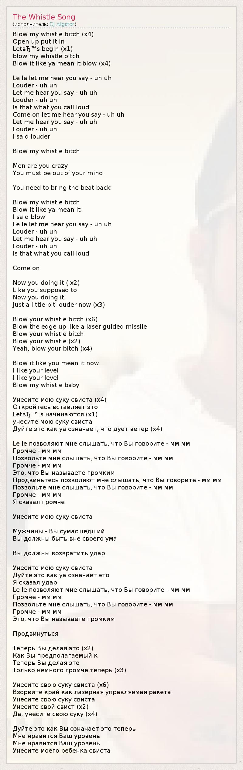 Blow my whistle bitch (x4) Open up put it in Let’s begin (x1) blow my whistle bitch Blow it like ya mean it blow (x4) Le le let me hear you say - uh uh Louder - uh uh Let me hear you say - uh uh Louder - uh uh Is that what you call loud Come on let me hear you say - uh uh Let me hear you say - uh uh Louder - uh uh I said louder Blow my whistle bitch Men are you crazy You must be out of your mind You need to bring the beat back Blow my whistle bitch Blow it like ya mean it I said blow Le le let me hear you say - uh uh Louder - uh uh Let me hear you say - uh uh Louder - uh uh Is that what you call loud Come on Now you doing it ( x2) Like you supposed to Now you doing it Just a little bit louder now (x3) Blow your whistle bitch (x6) Blow the edge up like a laser guided missile Blow your whistle bitch Blow your whistle (x2) Yeah, blow your bitch (x4) Blow it like you mean it now I like your level I like your level Blow my whistle baby Унесите мою суку свиста (x4) Откройтесь вставляет это Let†™ s начинаются (x1) унесите мою суку свиста Дуйте это как ya означает, что дует ветер (x4) Le le позволяют мне слышать, что Вы говорите - мм мм Громче - мм мм Позвольте мне слышать, что Вы говорите - мм мм Громче - мм мм Это, что Вы называете громким Продвиньтесь позволяют мне слышать, что Вы говорите - мм мм Позвольте мне слышать, что Вы говорите - мм мм Громче - мм мм Я сказал громче Унесите мою суку свиста Мужчины - Вы сумасшедший Вы должны быть вне своего ума Вы должны возвратить удар Унесите мою суку свиста Дуйте это как ya означает это Я сказал удар Le le позволяют мне слышать, что Вы говорите - мм мм Громче - мм мм Позвольте мне слышать, что Вы говорите - мм мм Громче - мм мм Это, что Вы называете громким Продвинуться Теперь Вы делая это (x2) Как Вы предполагаемый к Теперь Вы делая это Только немного громче теперь (x3) Унесите свою суку свиста (x6) Взорвите край как лазерная управляемая ракета Унесите свою суку свиста Унесите свой свист (x2) Да, унесите свою суку (x4) Дуйте это как Вы означает это теперь Мне нравится Ваш уровень Мне нравится Ваш уровень Унесите моего ребенка свиста