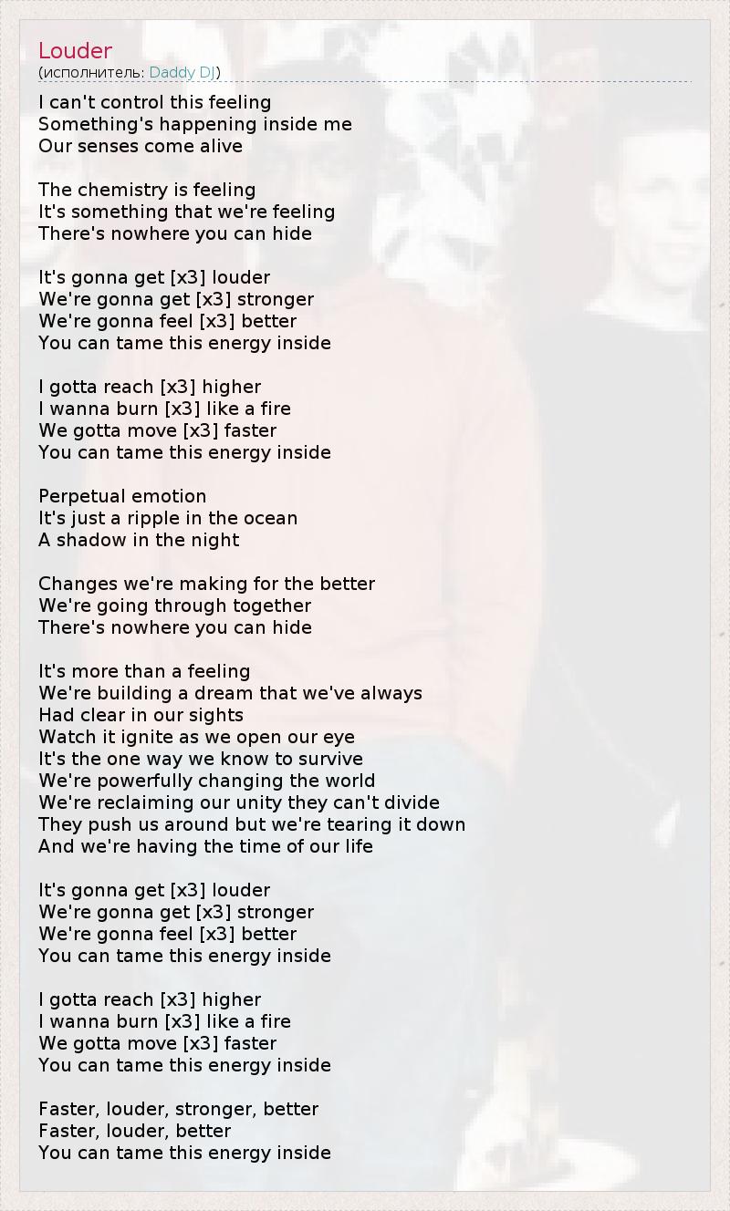 I can't control this feeling Something's happening inside me Our senses come alive The chemistry is feeling It's something that we're feeling There's nowhere you can hide It's gonna get [x3] louder We're gonna get [x3] stronger We're gonna feel [x3] better You can tame this energy inside I gotta reach [x3] higher I wanna burn [x3] like a fire We gotta move [x3] faster You can tame this energy inside Perpetual emotion It's just a ripple in the ocean A shadow in the night Changes we're making for the better We're going through together There's nowhere you can hide It's more than a feeling We're building a dream that we've always Had clear in our sights Watch it ignite as we open our eye It's the one way we know to survive We're powerfully changing the world We're reclaiming our unity they can't divide They push us around but we're tearing it down And we're having the time of our life It's gonna get [x3] louder We're gonna get [x3] stronger We're gonna feel [x3] better You can tame this energy inside I gotta reach [x3] higher I wanna burn [x3] like a fire We gotta move [x3] faster You can tame this energy inside Faster, louder, stronger, better Faster, louder, better You can tame this energy inside
