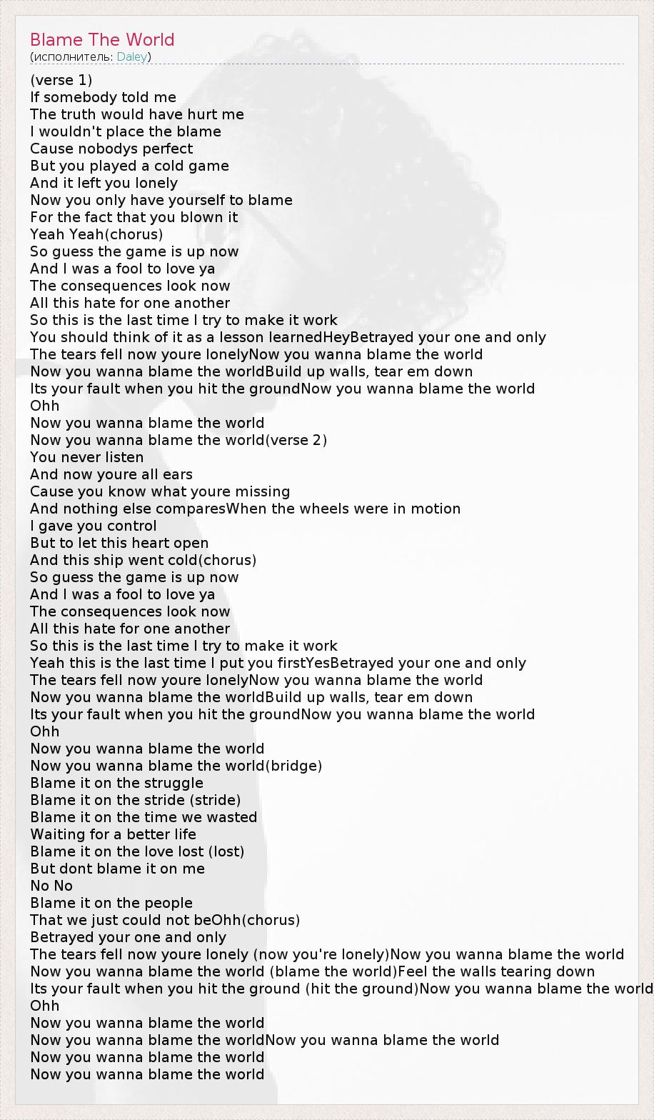 (verse 1) If somebody told me The truth would have hurt me I wouldn't place the blame Cause nobodys perfect But you played a cold game And it left you lonely Now you only have yourself to blame For the fact that you blown it Yeah Yeah(chorus) So guess the game is up now And I was a fool to love ya The consequences look now All this hate for one another So this is the last time I try to make it work You should think of it as a lesson learnedHeyBetrayed your one and only The tears fell now youre lonelyNow you wanna blame the world Now you wanna blame the worldBuild up walls, tear em down Its your fault when you hit the groundNow you wanna blame the world Ohh Now you wanna blame the world Now you wanna blame the world(verse 2) You never listen And now youre all ears Cause you know what youre missing And nothing else comparesWhen the wheels were in motion I gave you control But to let this heart open And this ship went cold(chorus) So guess the game is up now And I was a fool to love ya The consequences look now All this hate for one another So this is the last time I try to make it work Yeah this is the last time I put you firstYesBetrayed your one and only The tears fell now youre lonelyNow you wanna blame the world Now you wanna blame the worldBuild up walls, tear em down Its your fault when you hit the groundNow you wanna blame the world Ohh Now you wanna blame the world Now you wanna blame the world(bridge) Blame it on the struggle Blame it on the stride (stride) Blame it on the time we wasted Waiting for a better life Blame it on the love lost (lost) But dont blame it on me No No Blame it on the people That we just could not beOhh(chorus) Betrayed your one and only The tears fell now youre lonely (now you're lonely)Now you wanna blame the world Now you wanna blame the world (blame the world)Feel the walls tearing down Its your fault when you hit the ground (hit the ground)Now you wanna blame the world Ohh Now you wanna blame the world Now you wanna blame the worldNow you wanna blame the world Now you wanna blame the world Now you wanna blame the world