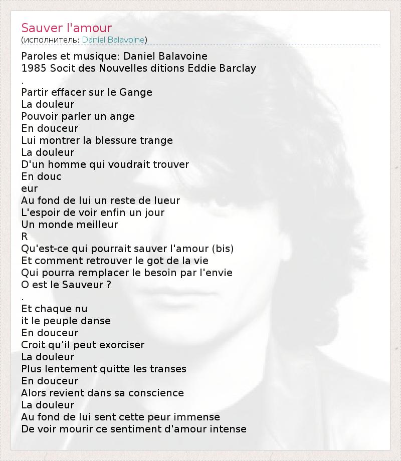 Paroles et musique: Daniel Balavoine 1985 Socit des Nouvelles ditions Eddie Barclay . Partir effacer sur le Gange La douleur Pouvoir parler un ange En douceur Lui montrer la blessure trange La douleur D'un homme qui voudrait trouver En douc eur Au fond de lui un reste de lueur L'espoir de voir enfin un jour Un monde meilleur R Qu'est-ce qui pourrait sauver l'amour (bis) Et comment retrouver le got de la vie Qui pourra remplacer le besoin par l'envie O est le Sauveur ? . Et chaque nu it le peuple danse En douceur Croit qu'il peut exorciser La douleur Plus lentement quitte les transes En douceur Alors revient dans sa conscience La douleur Au fond de lui sent cette peur immense De voir mourir ce sentiment d'amour intense