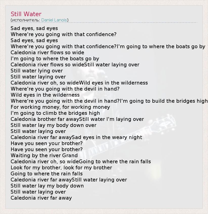 Sad eyes, sad eyes Where're you going with that confidence? Sad eyes, sad eyes Where're you going with that confidence?I'm going to where the boats go by Caledonia river flows so wide I'm going to where the boats go by Caledonia river flows so wideStill water laying over Still water lying over Still water laying over Caledonia river oh, so wideWild eyes in the wilderness Where're you going with the devil in hand? Wild eyes in the wilderness Where're you going with the devil in hand?I'm going to build the bridges high For working money, for working money I'm going to climb the bridges high Caledonia brother far awayStill water I'm laying over Still water lay my body down over Still water laying over Caledonia river far awaySad eyes in the weary night Have you seen your brother? Have you seen your brother? Waiting by the river Grand Caledonia river oh, so wideGoing to where the rain falls Look for my brother, look for my brother Going to where the rain falls Caledonia river far awayStill water laying over Still water lay my body down Still water laying over Caledonia river far away