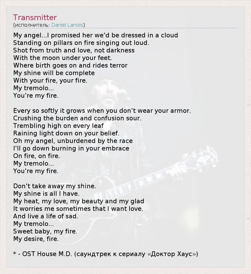 My angel...I promised her we'd be dressed in a cloud Standing on pillars on fire singing out loud. Shot from truth and love, not darkness With the moon under your feet. Where birth goes on and rides terror My shine will be complete With your fire, your fire. My tremolo... You're my fire. Every so softly it grows when you don't wear your armor. Crushing the burden and confusion sour. Trembling high on every leaf Raining light down on your belief. Oh my angel, unburdened by the race I'll go down burning in your embrace On fire, on fire. My tremolo... You're my fire. Don't take away my shine. My shine is all I have. My heat, my love, my beauty and my glad It worries me sometimes that I want love. And live a life of sad. My tremolo... Sweet baby, my fire. My desire, fire. * - OST House M.D. (саундтрек к сериалу «Доктор Хаус»)