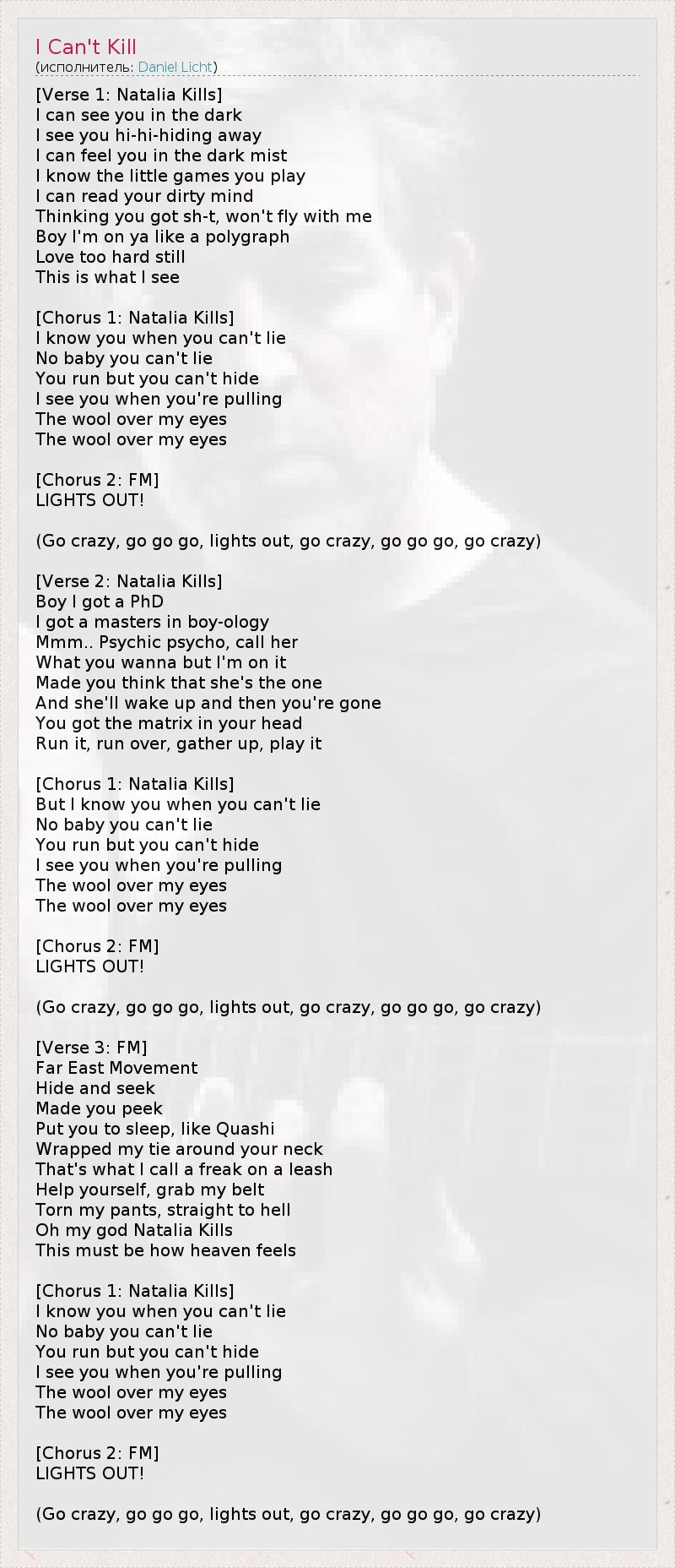 [Куплет 1: Natalia Kills] Я вижу тебя в темноте, Вижу, как ты прячешься. Я чувствую тебя в сумрачном тумане, Мне знакомы твои хитрости. 1 Я читаю твои грязные мысли. Считаешь себя слишком крутым, чтобы связываться со мной. Парень, я для тебя как полиграф. Люблю сильно, и всё же Вот что я понимаю... [Припев: Natalia Kills] Я знаю, когда у тебя не получается солгать, Нет, малыш, ты не умеешь лгать. Ты убегаешь, но тебе не спрятаться. Я вижу тебя насквозь, когда ты Пытаешься меня одурачить, Пытаешься меня одурачить... [Припев 2: FM] Тушите свет! (Сходите с ума, да-да-да, тушите свет! Сходите с ума, да-да-да, сходите с ума!) [Куплет 2: Natalia Kills] Парень, у меня есть учёная степень И диплом магистра в парне-ологии - Ммм... больная психопатка! Зови меня, Как хочешь - я с этим справлюсь. Заставила тебя поверить, что я единственная. Просыпаюсь - а тебя нет. У тебя в голове матрица, Выйди, выйди за её пределы, соберись с силами, рискни! [Припев: Natalia Kills] Я знаю, когда у тебя не получается солгать, Нет, малыш, ты не умеешь лгать. Ты убегаешь, но тебе не спрятаться. Я вижу тебя насквозь, когда ты Пытаешься меня одурачить, Пытаешься меня одурачить... [Припев 2: FM] Тушите свет! (Сходите с ума, да-да-да, тушите свет! Сходите с ума, да-да-да, сходите с ума!) [Куплет 3: FM] Far East Movement! Играя в прятки, Заставил тебя подглядывать И уложил спать, как доверчивый парниша. 2 Затянул свой галстук на твоей шее - Вот что я называю "фрик на поводке". Угощайся: берусь за пояс И срываю штаны - прямиком к моему "дружку"! 3 О, Боже, Natalia Kills! Должно быть, это и есть рай! [Припев: Natalia Kills] Я знаю, когда у тебя не получается солгать, Нет, малыш, ты не умеешь лгать. Ты убегаешь, но тебе не спрятаться. Я вижу тебя насквозь, когда ты Пытаешься меня одурачить, Пытаешься меня одурачить... [Припев 2: FM] Тушите свет! (Сходите с ума, да-да-да, тушите свет! Сходите с ума, да-да-да, сходите с ума!) 1 - little game (устойч.) = хитрость. Дословно: Мне знакомы игры, в которые ты играешь 2 - словарь Collins толкует слово Quashi (карибского происхождения) как "бесхитростный или доверчивый темнокожий крестьянин" 3 - hell (сленг) = мужской половой орган/женский лобок