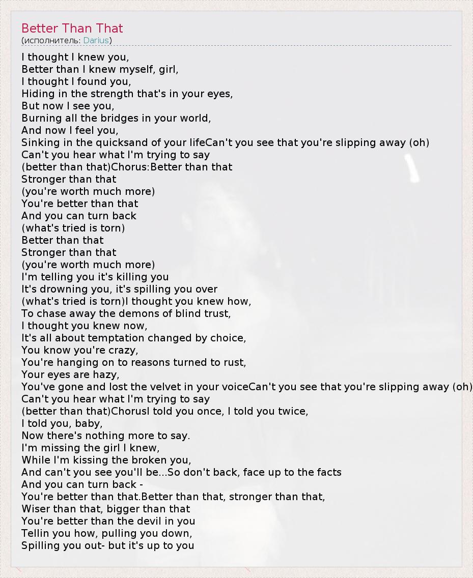 I thought I knew you, Better than I knew myself, girl, I thought I found you, Hiding in the strength that's in your eyes, But now I see you, Burning all the bridges in your world, And now I feel you, Sinking in the quicksand of your lifeCan't you see that you're slipping away (oh) Can't you hear what I'm trying to say (better than that)Chorus:Better than that Stronger than that (you're worth much more) You're better than that And you can turn back (what's tried is torn) Better than that Stronger than that (you're worth much more) I'm telling you it's killing you It's drowning you, it's spilling you over (what's tried is torn)I thought you knew how, To chase away the demons of blind trust, I thought you knew now, It's all about temptation changed by choice, You know you're crazy, You're hanging on to reasons turned to rust, Your eyes are hazy, You've gone and lost the velvet in your voiceCan't you see that you're slipping away (oh) Can't you hear what I'm trying to say (better than that)ChorusI told you once, I told you twice, I told you, baby, Now there's nothing more to say. I'm missing the girl I knew, While I'm kissing the broken you, And can't you see you'll be...So don't back, face up to the facts And you can turn back - You're better than that.Better than that, stronger than that, Wiser than that, bigger than that You're better than the devil in you Tellin you how, pulling you down, Spilling you out- but it's up to you