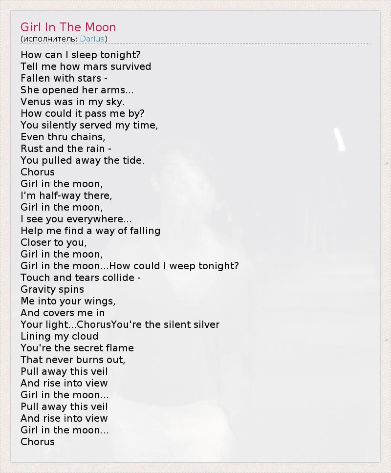 How can I sleep tonight? Tell me how mars survived Fallen with stars - She opened her arms... Venus was in my sky. How could it pass me by? You silently served my time, Even thru chains, Rust and the rain - You pulled away the tide. Chorus Girl in the moon, I'm half-way there, Girl in the moon, I see you everywhere... Help me find a way of falling Closer to you, Girl in the moon, Girl in the moon...How could I weep tonight? Touch and tears collide - Gravity spins Me into your wings, And covers me in Your light...ChorusYou're the silent silver Lining my cloud You're the secret flame That never burns out, Pull away this veil And rise into view Girl in the moon... Pull away this veil And rise into view Girl in the moon... Chorus