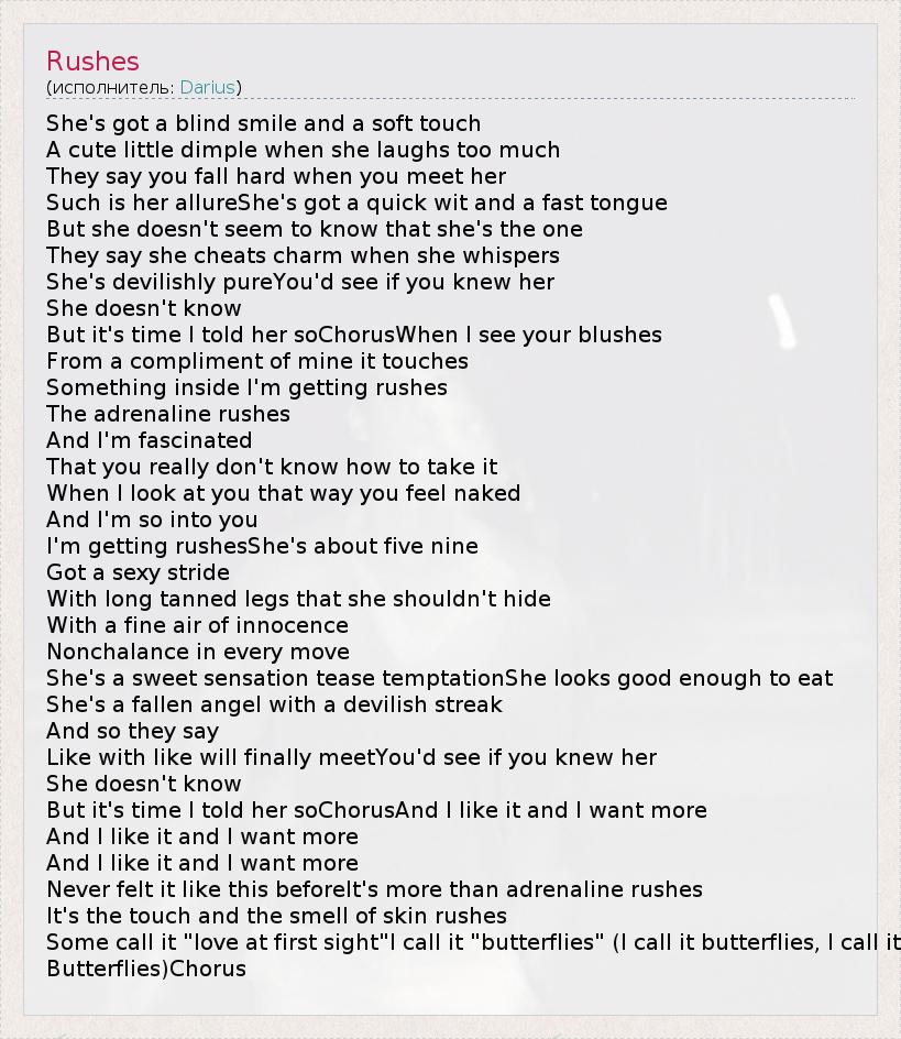 She's got a blind smile and a soft touch A cute little dimple when she laughs too much They say you fall hard when you meet her Such is her allureShe's got a quick wit and a fast tongue But she doesn't seem to know that she's the one They say she cheats charm when she whispers She's devilishly pureYou'd see if you knew her She doesn't know But it's time I told her soChorusWhen I see your blushes From a compliment of mine it touches Something inside I'm getting rushes The adrenaline rushes And I'm fascinated That you really don't know how to take it When I look at you that way you feel naked And I'm so into you I'm getting rushesShe's about five nine Got a sexy stride With long tanned legs that she shouldn't hide With a fine air of innocence Nonchalance in every move She's a sweet sensation tease temptationShe looks good enough to eat She's a fallen angel with a devilish streak And so they say Like with like will finally meetYou'd see if you knew her She doesn't know But it's time I told her soChorusAnd I like it and I want more And I like it and I want more And I like it and I want more Never felt it like this beforeIt's more than adrenaline rushes It's the touch and the smell of skin rushes Some call it "love at first sight"I call it "butterflies" (I call it butterflies, I call it Butterflies)Chorus