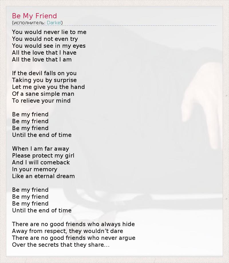 You would never lie to me You would not even try You would see in my eyes All the love that I have All the love that I am If the devil falls on you Taking you by surprise Let me give you the hand Of a sane simple man To relieve your mind Be my friend Be my friend Be my friend Until the end of time When I am far away Please protect my girl And I will comeback In your memory Like an eternal dream Be my friend Be my friend Be my friend Until the end of time There are no good friends who always hide Away from respect, they wouldn’t dare There are no good friends who never argue Over the secrets that they share…