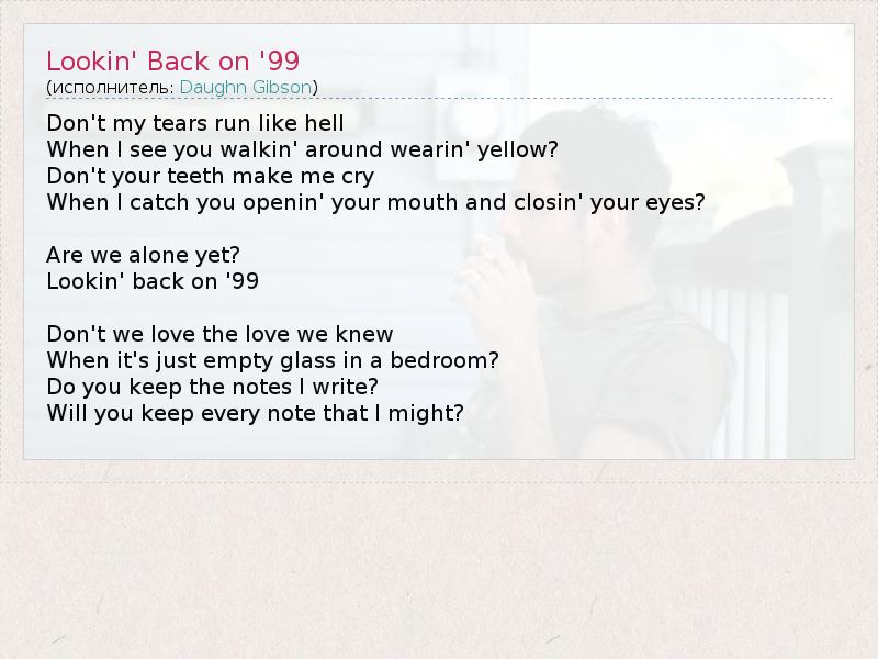Don't my tears run like hell When I see you walkin' around wearin' yellow? Don't your teeth make me cry When I catch you openin' your mouth and closin' your eyes? Are we alone yet? Lookin' back on '99 Don't we love the love we knew When it's just empty glass in a bedroom? Do you keep the notes I write? Will you keep every note that I might?