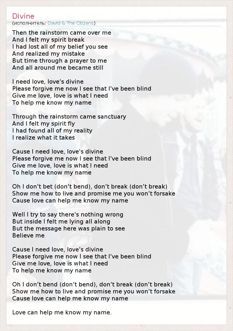 На меня пролился ливень, И я почувствовал, что мой дух сломлен. Как видишь, я потерял всю свою веру И понял свою ошибку, Но спустя время, читая молитву, И все вокруг меня замерло. Мне нужна любовь, божественная любовь. Пожалуйста, прости меня, теперь я вижу, что я был слеп. Подари мне любовь, любовь это то, что нужно мне, Чтобы узнать свое имя. Через этот ливень ко мне пришел покой, И я почувствовал, как мой дух воспарил. Я нашел свою реальность, Я понимаю, чего это стоит. Потому что мне нужна любовь, божественная любовь. Пожалуйста, прости меня, теперь я вижу, что я был слеп. Подари мне любовь, любовь это то, что нужно мне, Чтобы узнать свое имя. О, я не спорю (не прогибаюсь), не ломаюсь (не ломаюсь). Покажи мне, как жить, и пообещай мне, что не оставишь меня, Потому что любовь может помочь мне узнать свое имя. Я попытаюсь сказать, что все в порядке, Но внутри я почувствовал, что постоянно лгу, Но отсюда прекрасно видно это послание, Поверь мне. Потому что мне нужна любовь, божественная любовь. Пожалуйста, прости меня, теперь я вижу, что я был слеп. Подари мне любовь, любовь это то, что нужно мне, Чтобы узнать свое имя. О, я не спорю (не прогибаюсь), не ломаюсь (не ломаюсь). Покажи мне, как жить и пообещай мне, что не оставишь меня, Потому что любовь может помочь мне узнать свое имя. Любовь может помочь мне узнать свое имя.